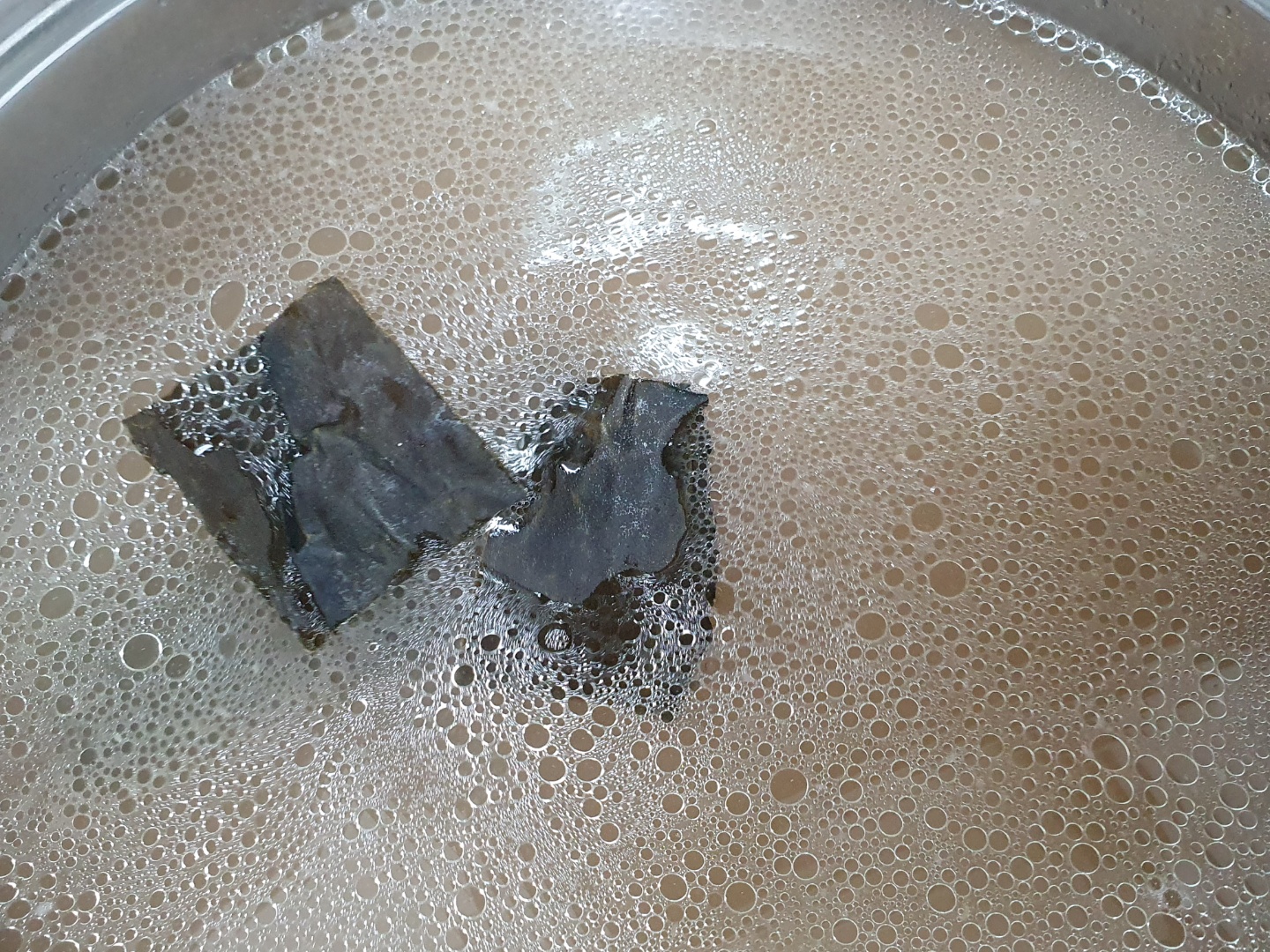 10분 정도 기다리면 다시마에서 진액이 나오면서 부유물을 흡착합니다.