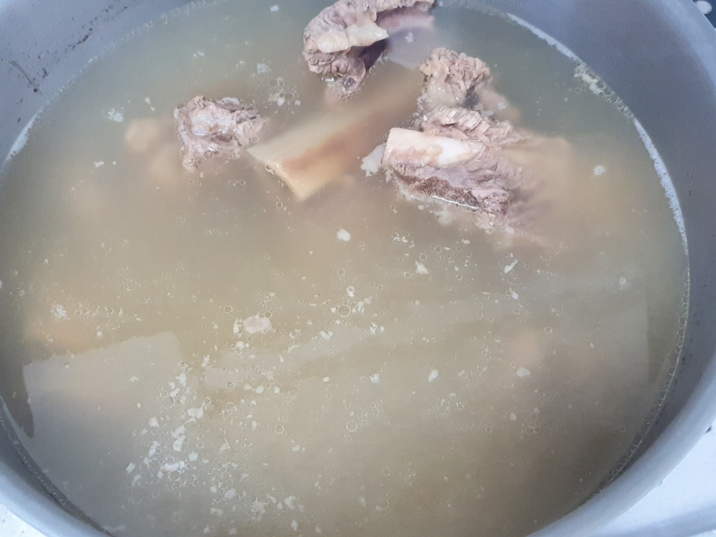 부유물을 거른 국물입니다. 이전보다 맑아졌습니다. 여기다 고기를 다시 넣어주고 고기가 쉽게 뼈에서 분리될 때까지 더 끓입니다.