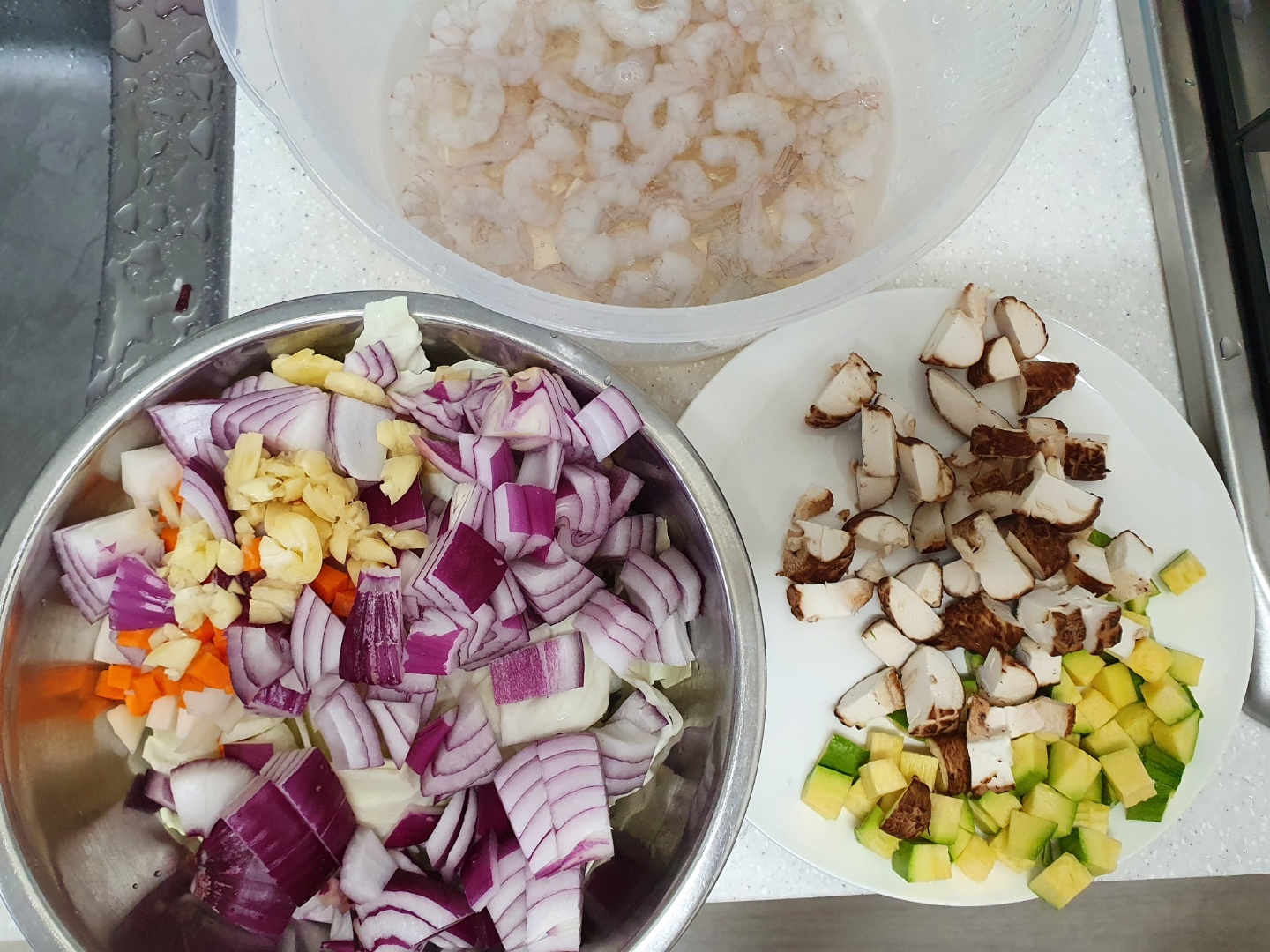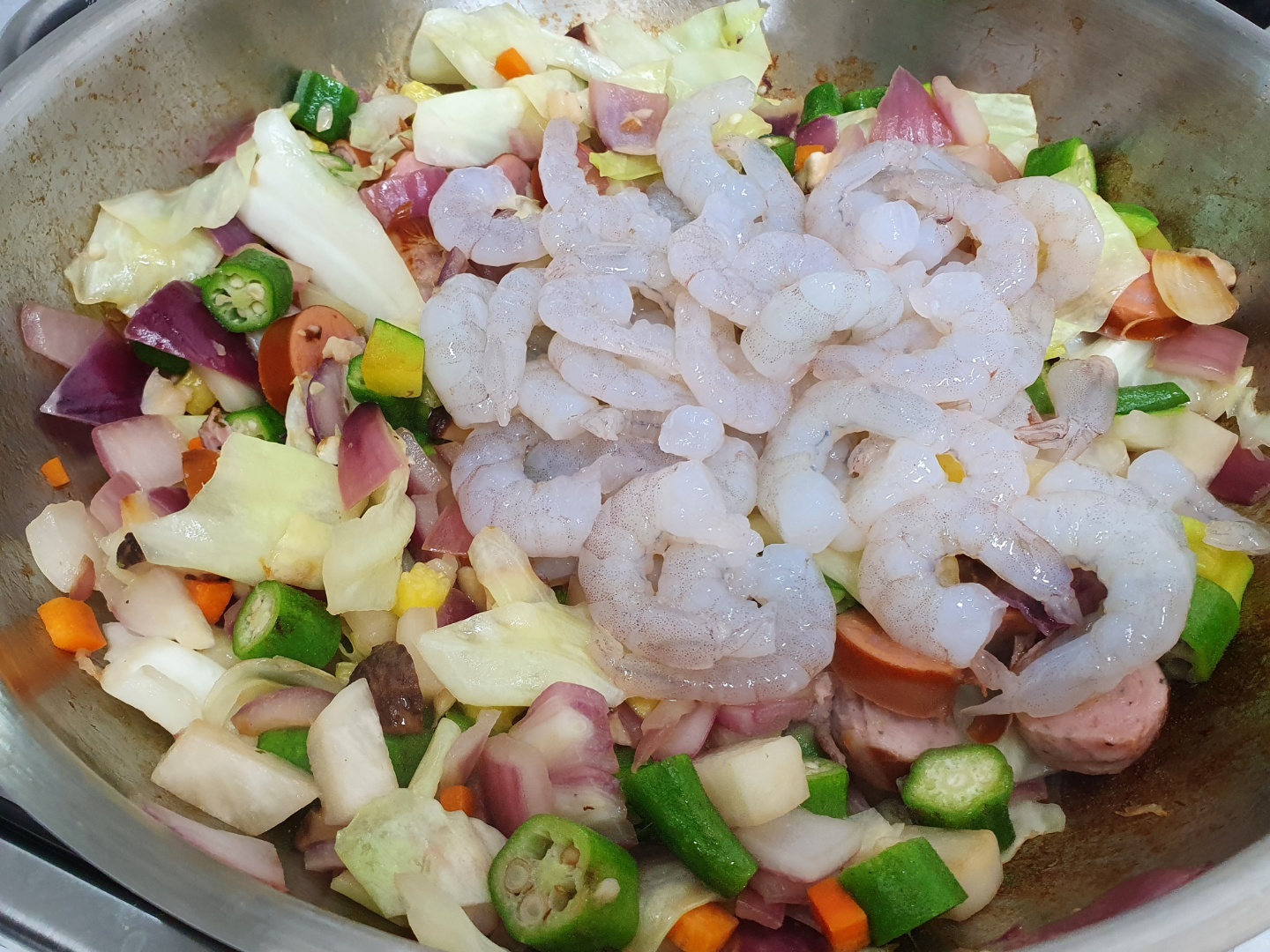 달궈진 웍에 기름을 두르고 단단한 채소를 먼저 볶습니다. 채소가 어느 정도 볶아졌으면, 애호박, 버섯, 소시지, 버섯, 새우를 넣습니다.