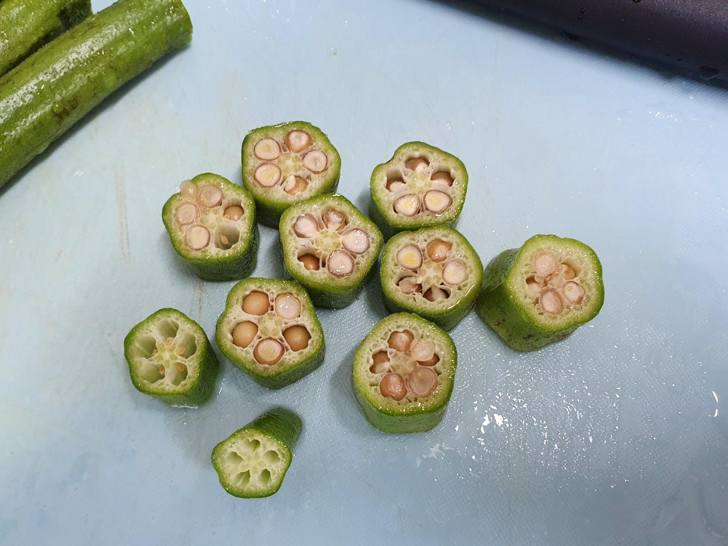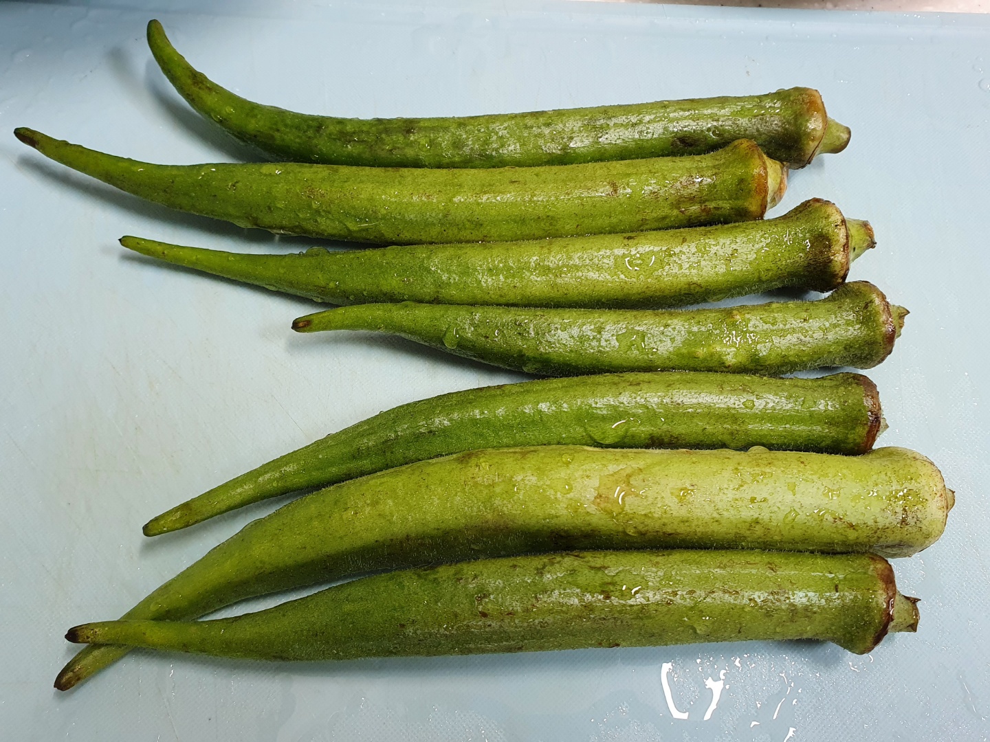 오크라는 좀 특이하게 생겼습니다. 생긴 건 고추 비슷한데 맵지 않습니다. 5 각형이고 안에는 씨가 들어있습니다. 뮤신 성분이 있어 끈적거립니다. 검보에서 점성을 내는 역할을 합니다.