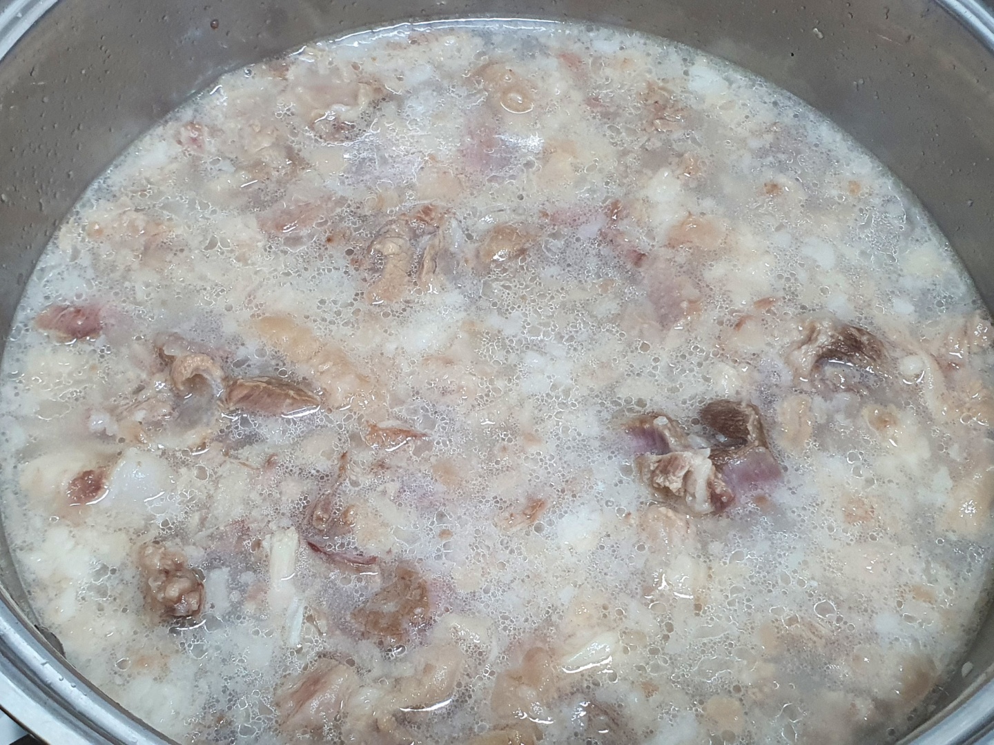 씻은 뼈와 고기를 찬물에 넣고 끓여줍니다. 물 양은... 굳이 잘 안 맞춰도 됩니다. 어차피 끓이다 보면 물 상당히 증발해버리기 때문에 처음부터 많이 넣거나, 아니면 졸아들면 더 넣어주거나 해야 합니다. 저는 최종적으론 고기와 뼈가 살짝 잠길 정도로 물이 남도록 합니다.