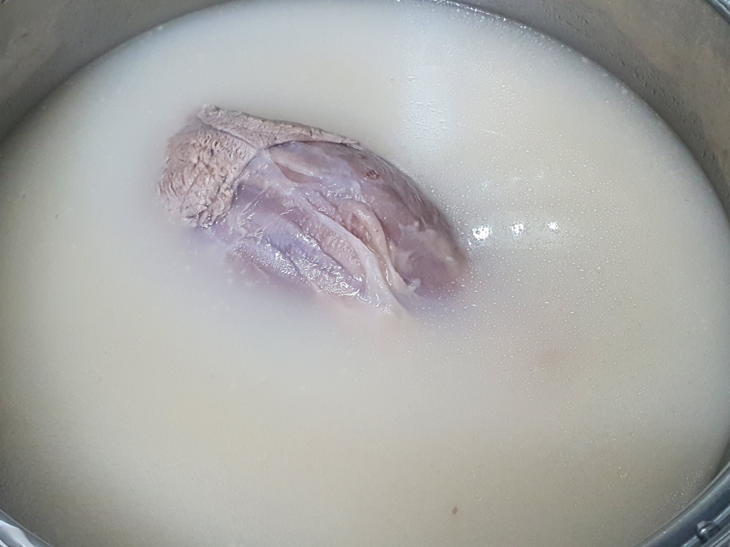늘 하던 대로 물에 담가서 녹이면서 핏물을 빼고, 초벌로 데쳐줍니다. 하지만 아롱사태는 거의 핏기가 안 나오니까 굳이 안 해도 됩니다. 미리 준비해둔 육수에 넣고 삶아줍니다.