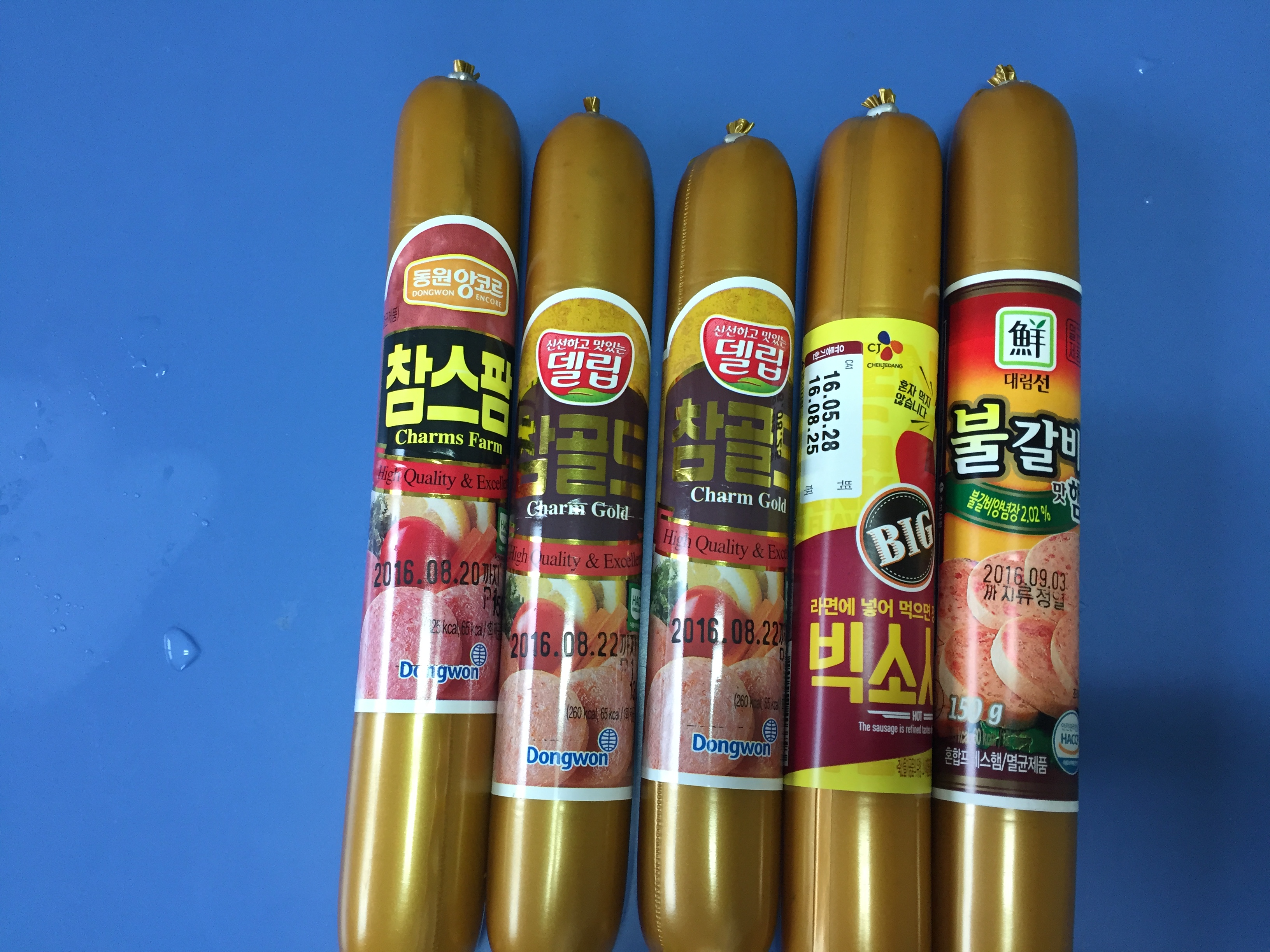 돈육 소시지이군요. 보통 저런 비닐에 들어있는 것은 어육소시지인데... 돈육 소시지는 그냥 먹으면 비려서 먹기 힘듭니다.