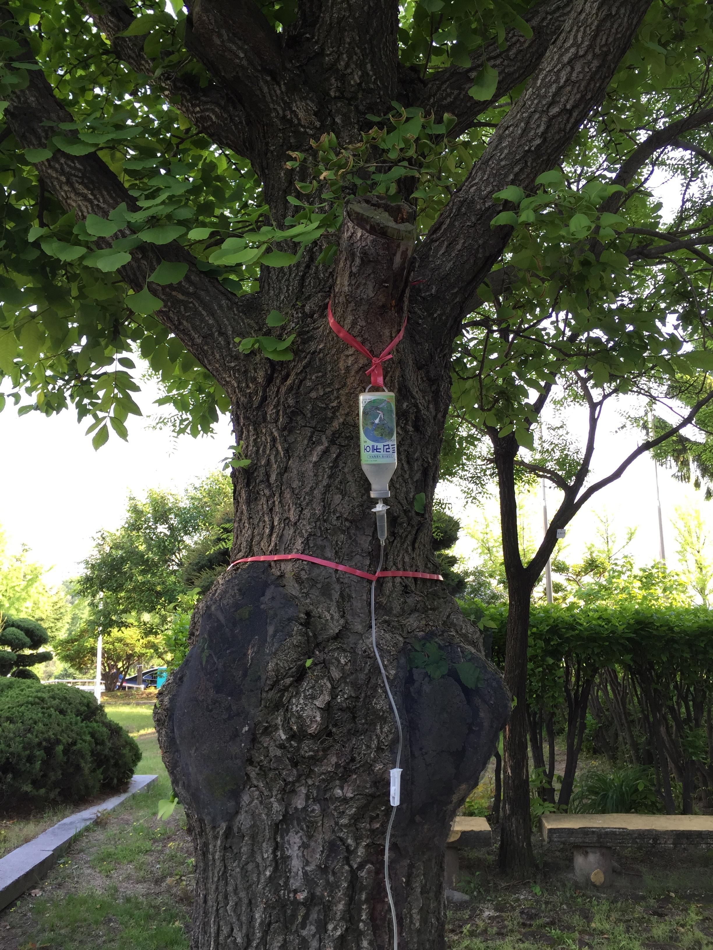 나무가 수액을 맞고 있습니다. 이 나무는 키메라입니다. 아래는 단풍잎인데, 위는 다른 잎입니다.