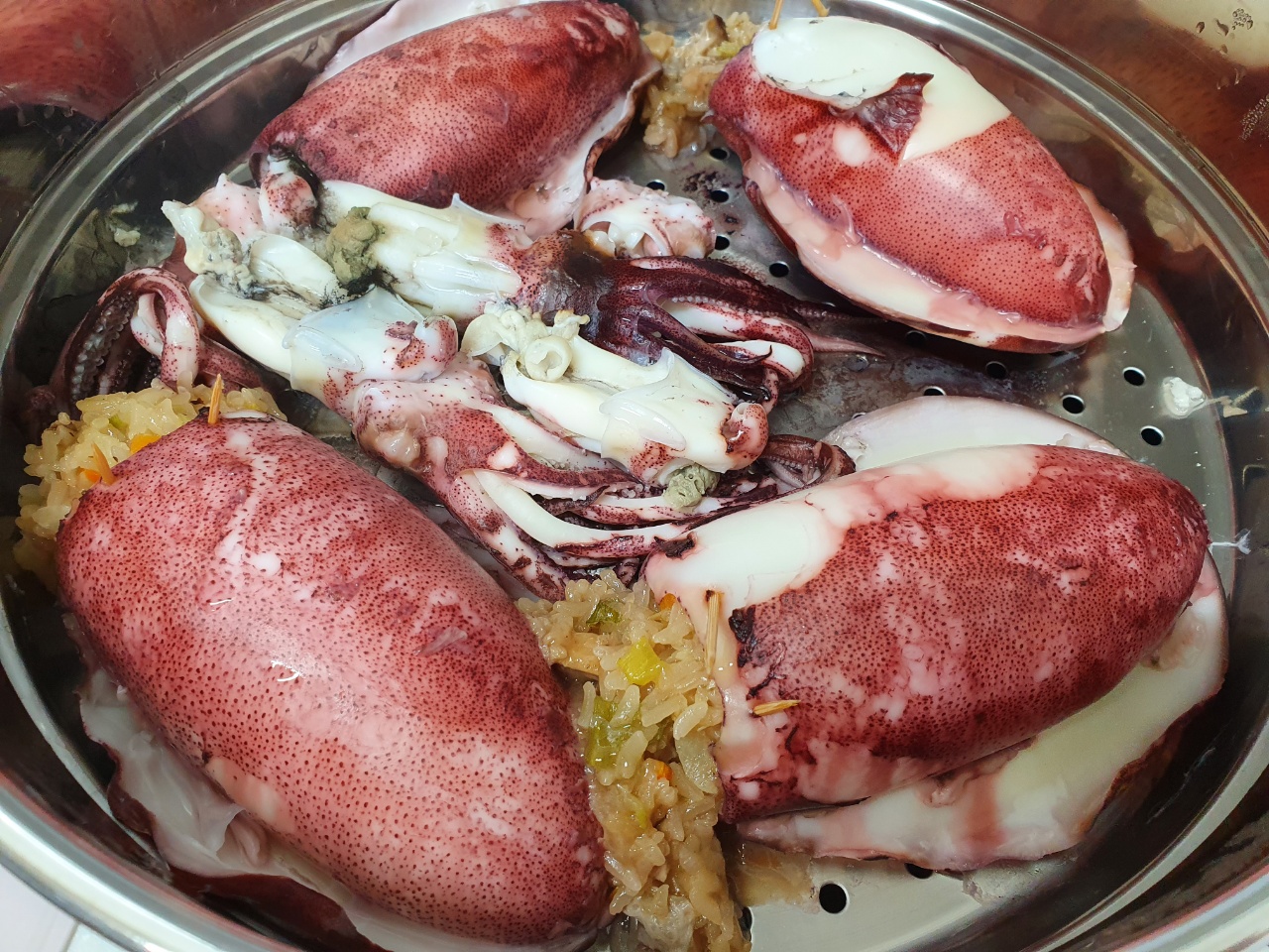 속에 재료를 넣고, 꼬치로 막아줍니다. 재료는 한 70% 채우면 된다고 하는데, 저는 재료가 너무 많아서 그냥 막 채워 넣었습니다. 센 불에서 물이 끓을 때까지 (10분쯤?) 찌다가, 중불로 줄여서 30분 정도 더 쪄줍니다. 총 40분을 찌고, 30분 뜸을 들였습니다.
