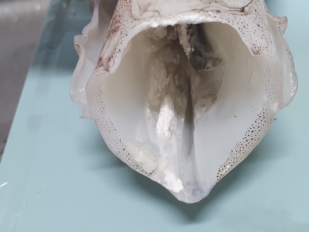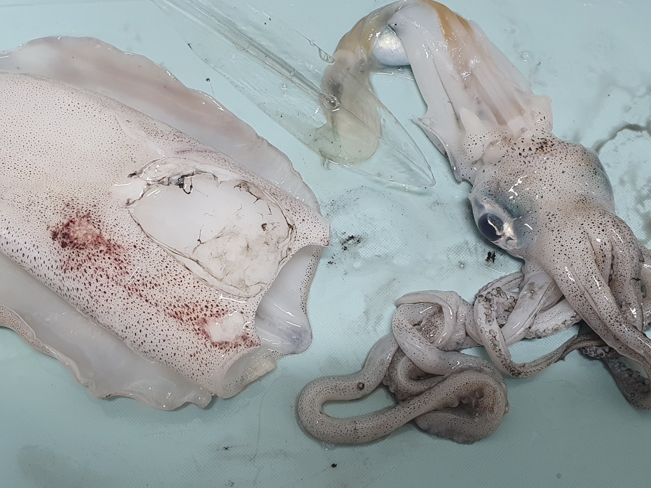 일단 물로 씻어줍니다. 오징어는 다리의 빨판에 날카로운 것들이 붙어있는데, 비비면 떨어져 나갑니다. 입의 부리도 약간 눌러주면 빠져나옵니다.