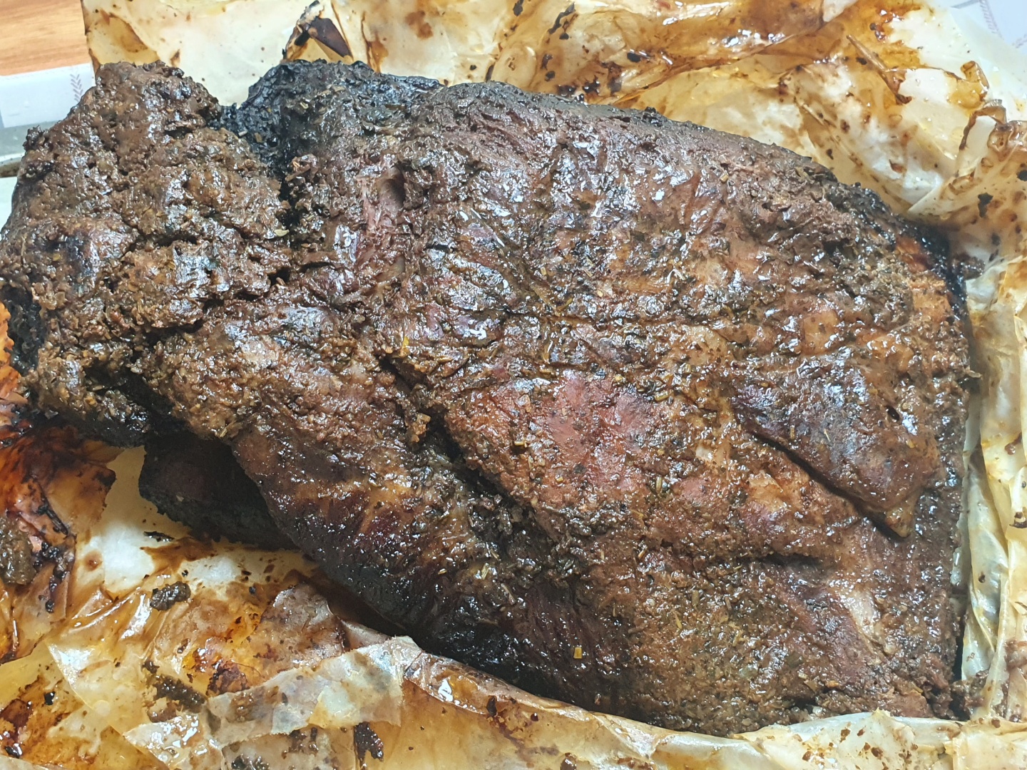 3시간 정도 지나면 꺼내서 고기를 포일로 잘 감싸줍니다. 저는 알루미늄이 싫어서 그냥 종이 포일을 사용했습니다. 고기 뜨겁고 무겁습니다. 그리고 수분이 많습니다. 포일로 싼 고기를 다시 오븐에 넣어주고, 170도 정도의 온도에서 6시간 정도 구워줍니다. 저는 160도에서 시작해서 단계적으로 180도까지 올렸습니다. 오븐마다 차이가 있을 테니 적당히 조절해야 합니다. 하지만 180도까지는 안 가는 게 좋습니다. 한 160에서 165까지만 가면 될 것 같습니다.