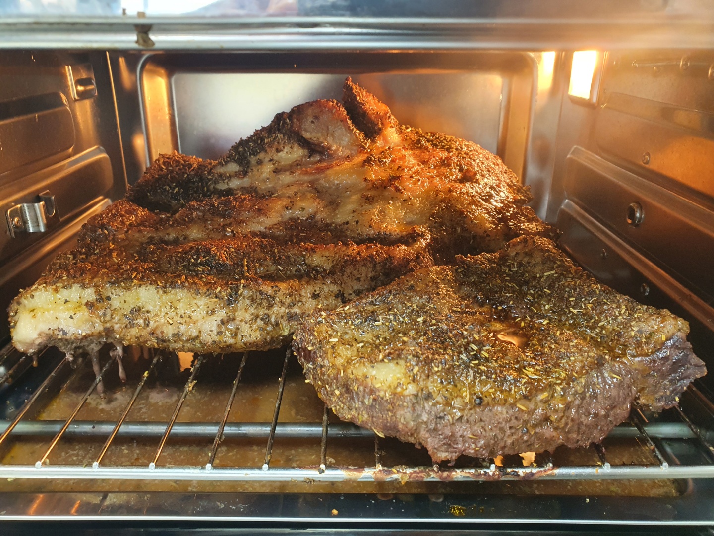 오븐에 어떻게든 잘 넣어줍니다. 일단 120 정도의 저온에서 3시간 정도 구웠습니다. 겉이 마르지 않도록 30분마다 물을 좀 발라줬습니다. 구울 때 고기가 수축하면서 높이가 높아질 수 있습니다. 열선에 안 닿게 조심해야 합니다.