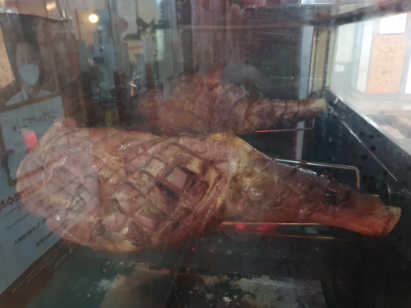 초벌로 익혀서 나오기 때문에 미리 예약을 해야 합니다. 2시간 30분 전에 예약을 하고 가게에 갔더니, 가게 밖에 있는 기계에서 초벌 구이가 준비되고 있었습니다. 가격은 다리 하나에 58000원입니다. 양은 3~4인분 정도 됩니다.