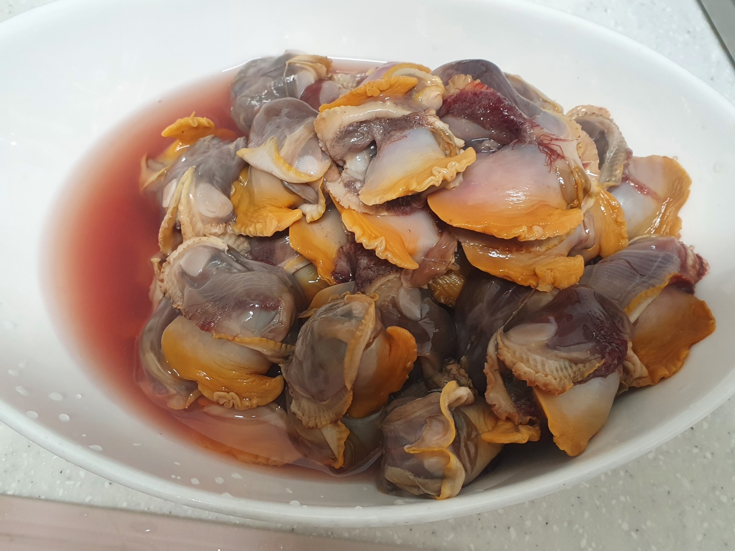 까고 난 것을 그릇에 담았는데, 살짝 데쳐서 피가 많이 나왔습니다. 이러니까 피조개라고 부른다는 느낌이 확 듭니다.
