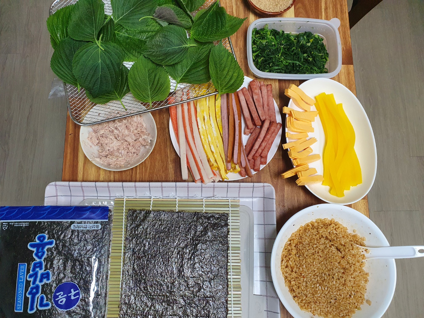 밥을 김에 깔아줍니다. 재료가 많이 들어갈 경우, 너무 두꺼워지기 때문에 밥알 1층 (싱글 레이어)으로 너무 많이 넣지 않는 것이 좋습니다. 밥을 깔아준 후 재료를 적당히 올립니다. 참치는 깻잎으로 감싸서 넣습니다.
