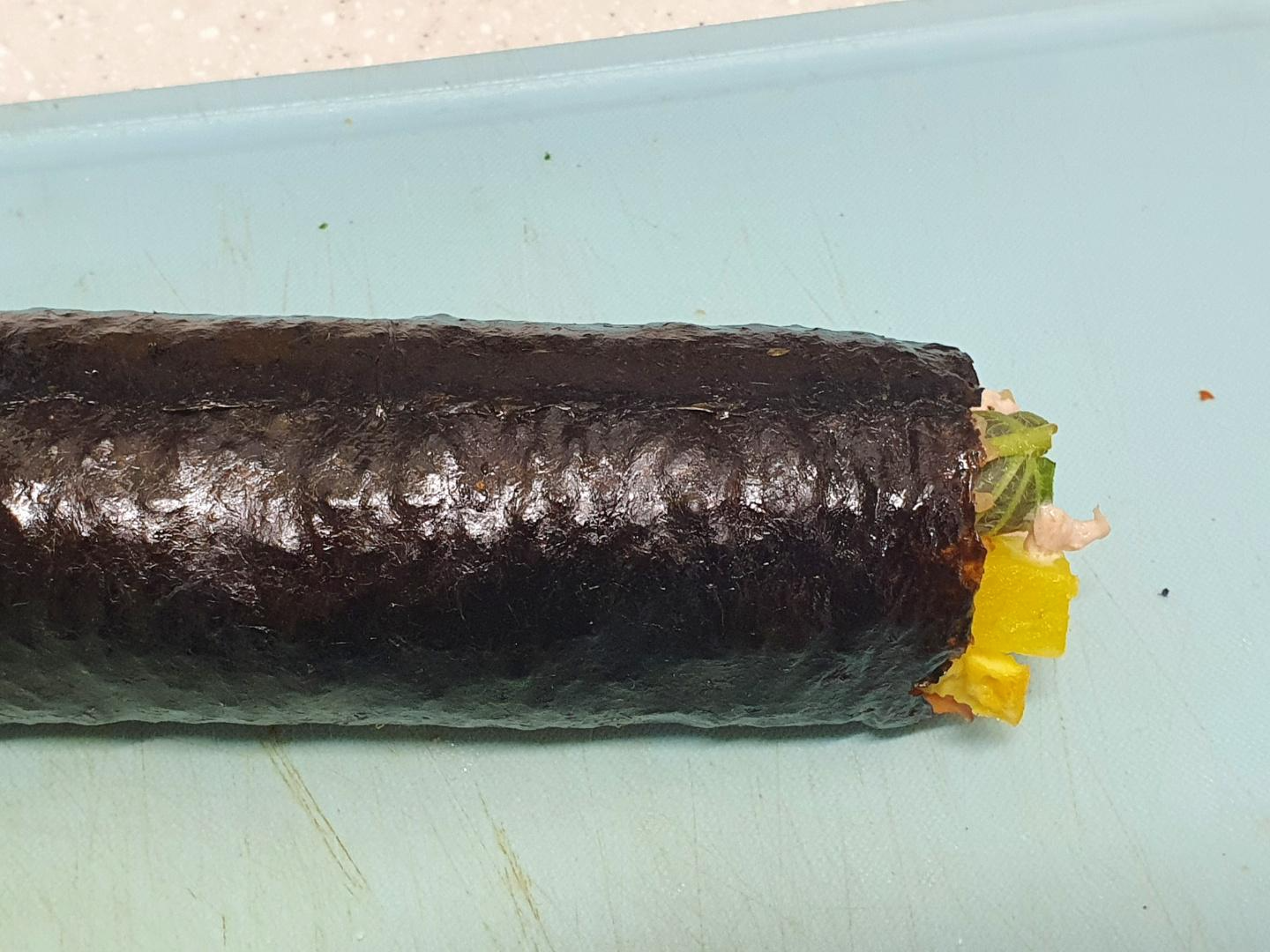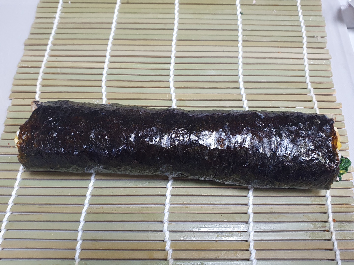 일단 김밥을 말았을 때는 김이 바삭한 상태라 끝부분이 잘 안 붙어 있고 따로 놉니다. 여기에 기름을 바르는 방법도 있긴 하지만, 끝부분이 바닥이 되도록 도마에 놓고 1분 정도 방치하면, 알아서 눅지면서 끝부분이 잘 붙게 됩니다.