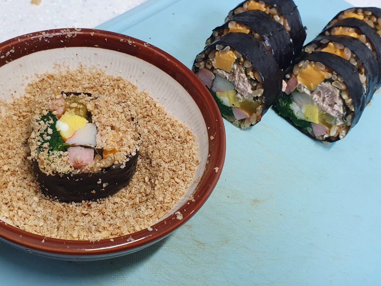 잘 잘렸습니다. 자른 단면인데, 밥알은 1층입니다. 간 깨에 김밥을 찍어먹으면 고소합니다.