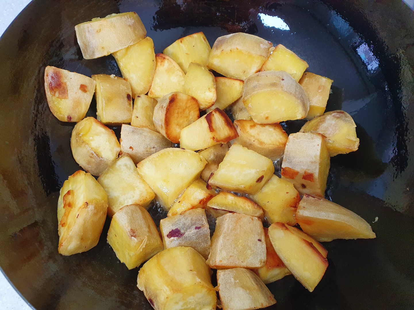 적당히 저정도 상태가 되면 고구마 튀김을 넣어줍니다. 에이 고구마 튀김이 아니라 튀긴 고구마에요. 튀긴 고구마! 튀!긴!고!구!마!