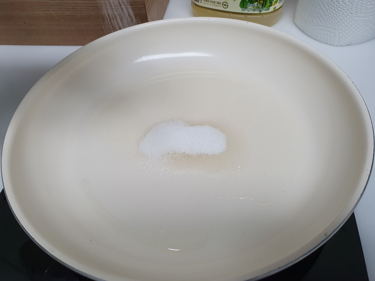 일단 프라이팬에 기름을 두르고, 설탕을 넣습니다. 그냥 취향대로. 취향은 존중합니다.