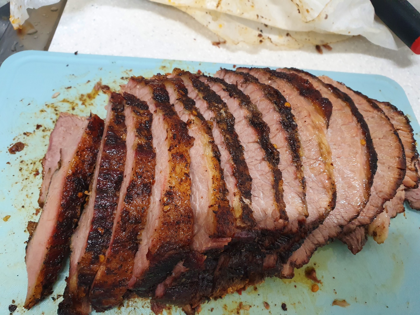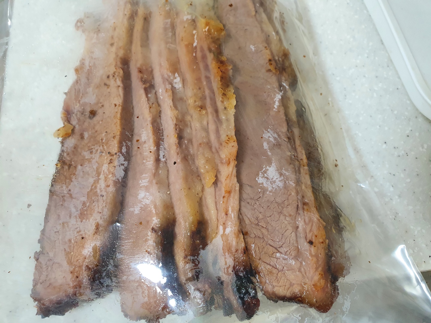 보통 때는 지방이 완전히 다 녹아버리는데... 150도로 올린 후에 1시간 정도만 더 했으면 더 부드러워졌을 것 같습니다. 뭐 이 정도만 해도 근처에서 파는 브리스킷보다는 더 부드러웠습니다. 양지에서 상상하기 어려운 부드러움입니다.