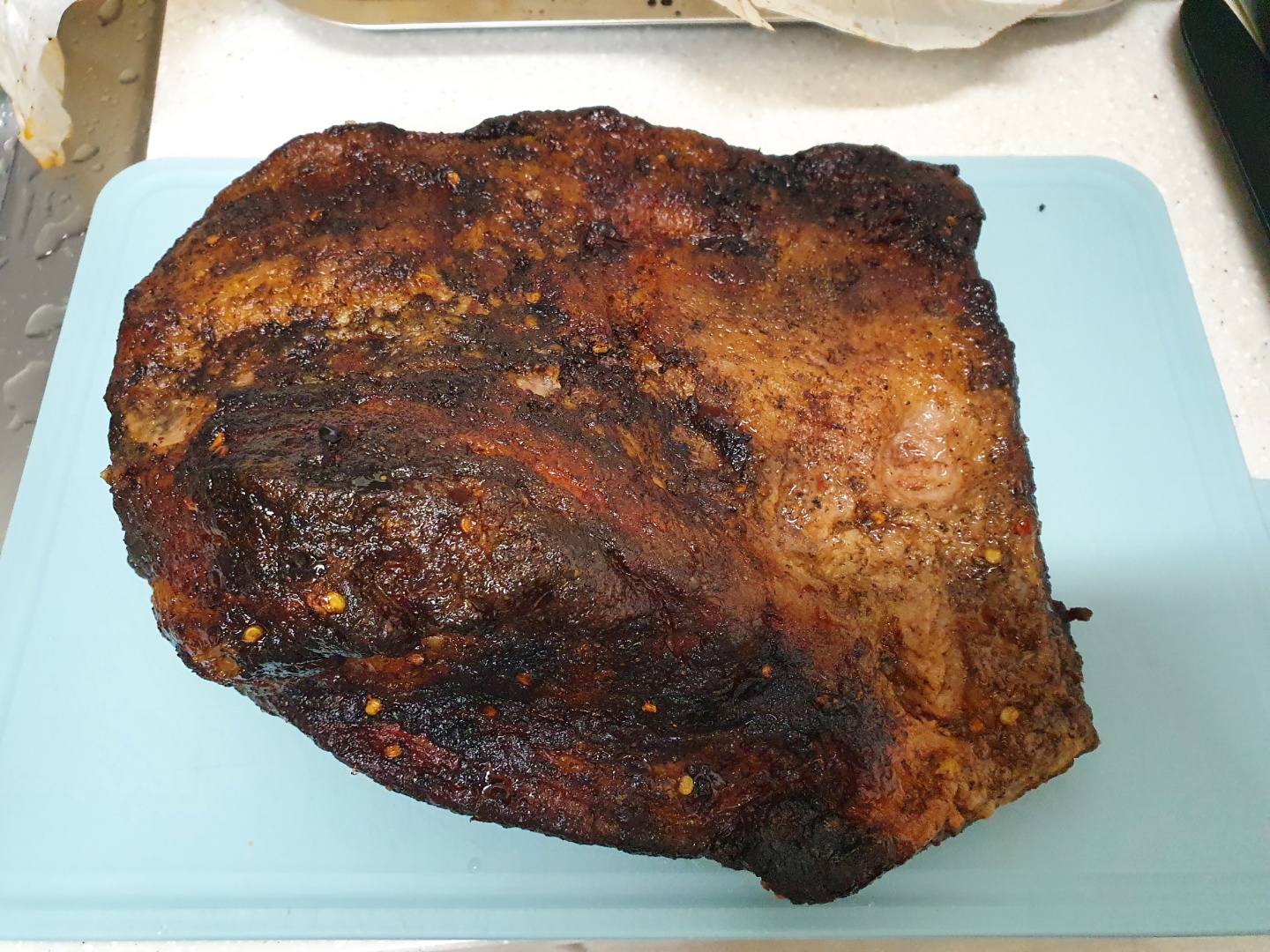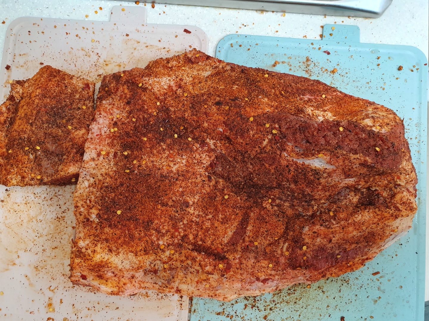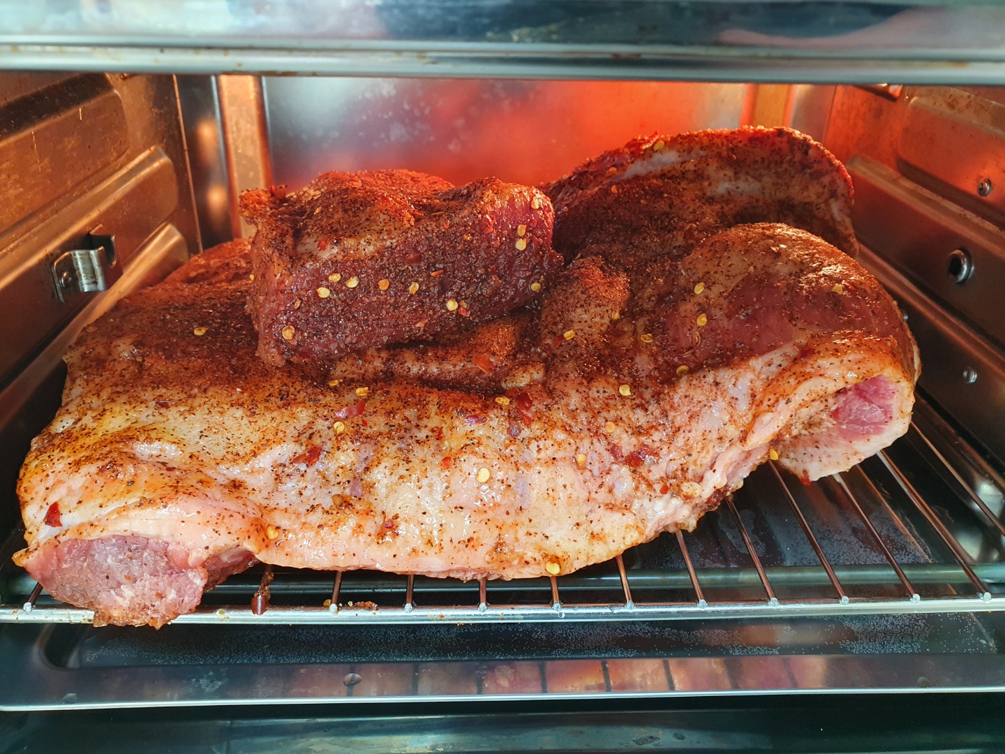 고기가 너무 커서 오븐에 안 들어가서 조금 잘랐습니다. 브리스킷 럽을 발라줍니다. 로켓 직구로 구매했습니다. 재료는 설탕, 파프리카 가루, 고춧가루인 것 같고, 살짝 라면수프 같은 맛이 나고, 염분도 많이 들어있어서 소금을 추가로 넣어주지 않아도 됩니다. 처음 샀을 때는 브리스킷 럽 맞는지 의문이었는데, 완성된 것을 먹어보니 잘 어울립니다.