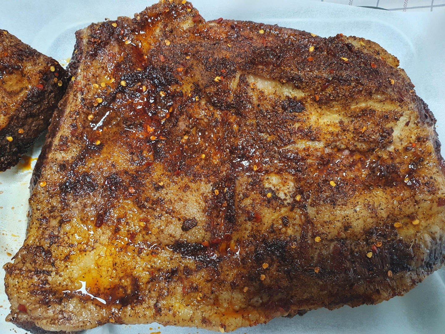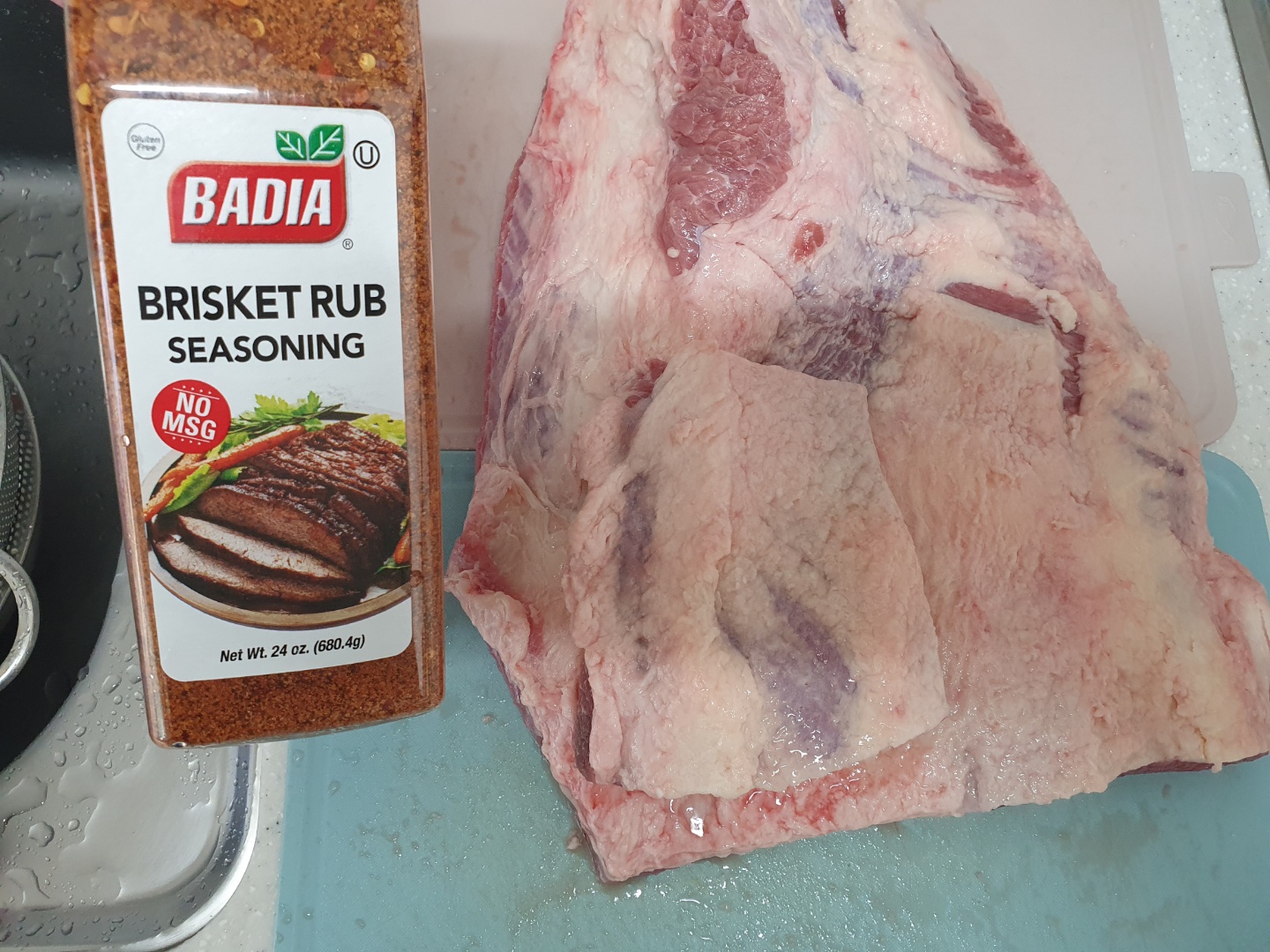 고기가 너무 커서 오븐에 안 들어가서 조금 잘랐습니다. 브리스킷 럽을 발라줍니다. 로켓 직구로 구매했습니다. 재료는 설탕, 파프리카 가루, 고춧가루인 것 같고, 살짝 라면수프 같은 맛이 나고, 염분도 많이 들어있어서 소금을 추가로 넣어주지 않아도 됩니다. 처음 샀을 때는 브리스킷 럽 맞는지 의문이었는데, 완성된 것을 먹어보니 잘 어울립니다.