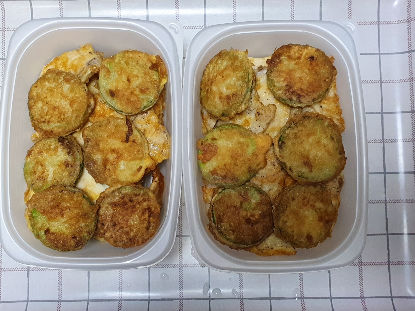 다 익은 것은 종이에 올려서 기름을 제거합니다. 계란이 애매하게 남아서 호박전도 만들었습니다. 내일 직장에 가져가려고 도시락통에 담았습니다.