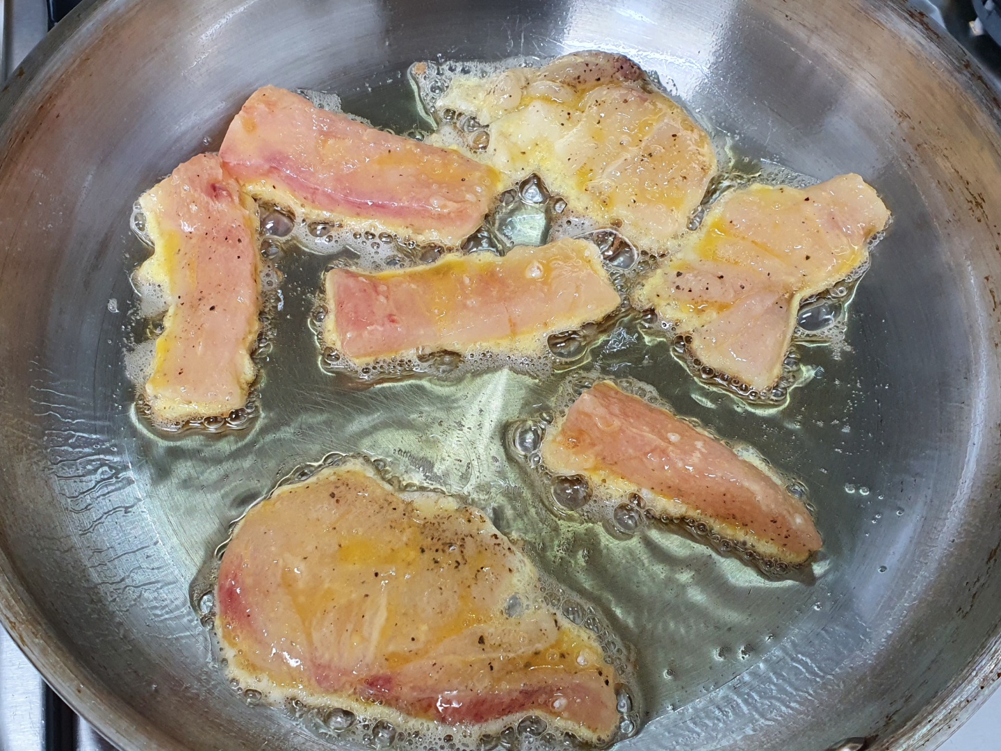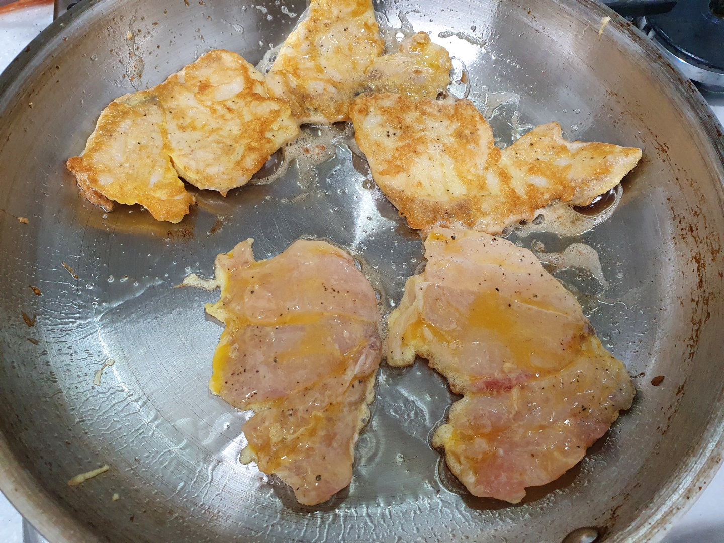 부침가루를 묻히고, 계란을 입혀서 부쳐줍니다.
