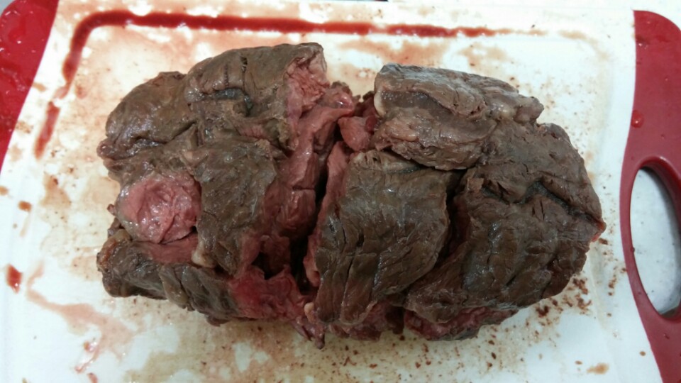 통 부채살을 못 구해서 그냥 두껍게 썰어져 있는 것을 사서, 지퍼락에 넣고 냄비에 물 적당히 끓이고 손으로 만져가면서 느낌상 60도 정도 되도록 조절해서 했습니다. (집에 온도계도 없었습니다.) 그때는 아마 4시간 정도 했던 것 같네요.