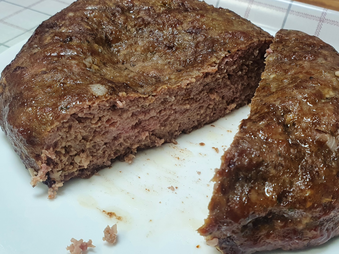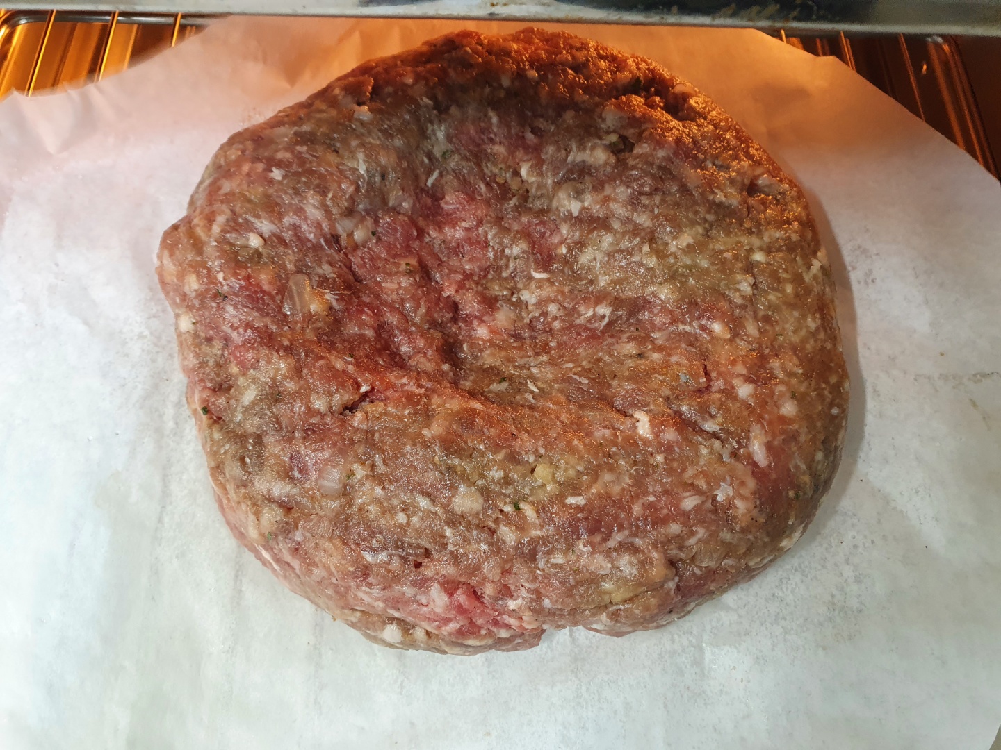 남은 패티 중 일부는 놀러 온 후배한테 줬고, 남은 것을 전부 뭉쳐서 구웠습니다. 이번엔 오븐에서 110에서 1시간 반을 구웠습니다. 가운데가 부풀 어오를 것 같아서 미리 좀 눌렀습니다.