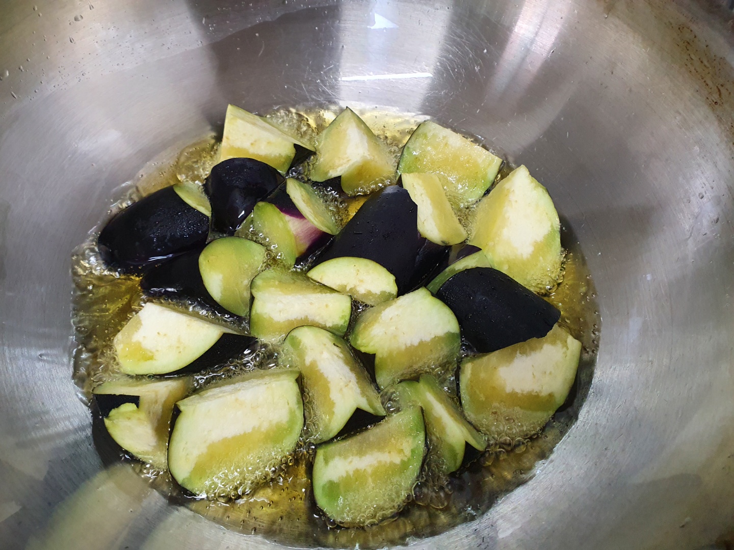 가지를 적당히 썰어서 기름에 튀깁니다. 기름을 많이 넣지 않으면 죄다 가지에 흡수당해서 기름이 전부 사라집니다... 하지만 익으면서 다시 배출됩니다. 그래도 많이 넣고 제대로 튀겨지도록 하는 것이 맛있습니다. 제대로 안튀겨지면 별로입니다. 완전히 흐물흐물할 때까지 튀겨야 합니다.