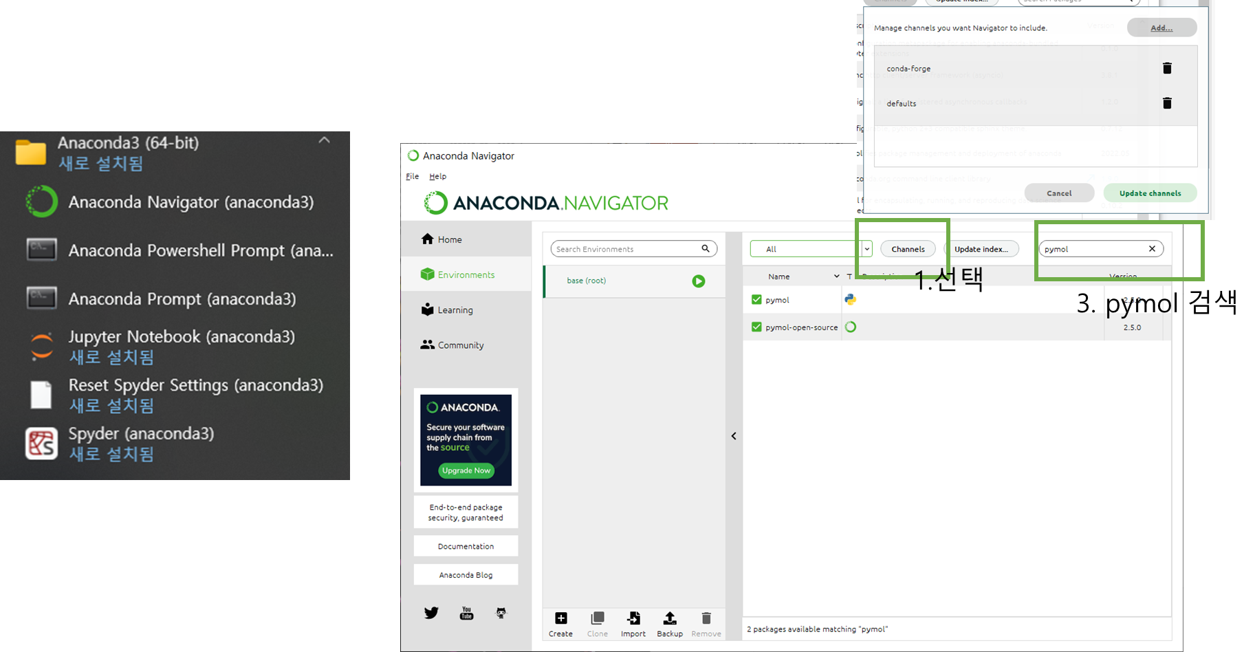 enviroments에서 채널을 눌러서 conda-forge를 추가해줍니다. 그리고 pymol을 검색하시면 pymol-open-source 를 설치할 수 있습니다.