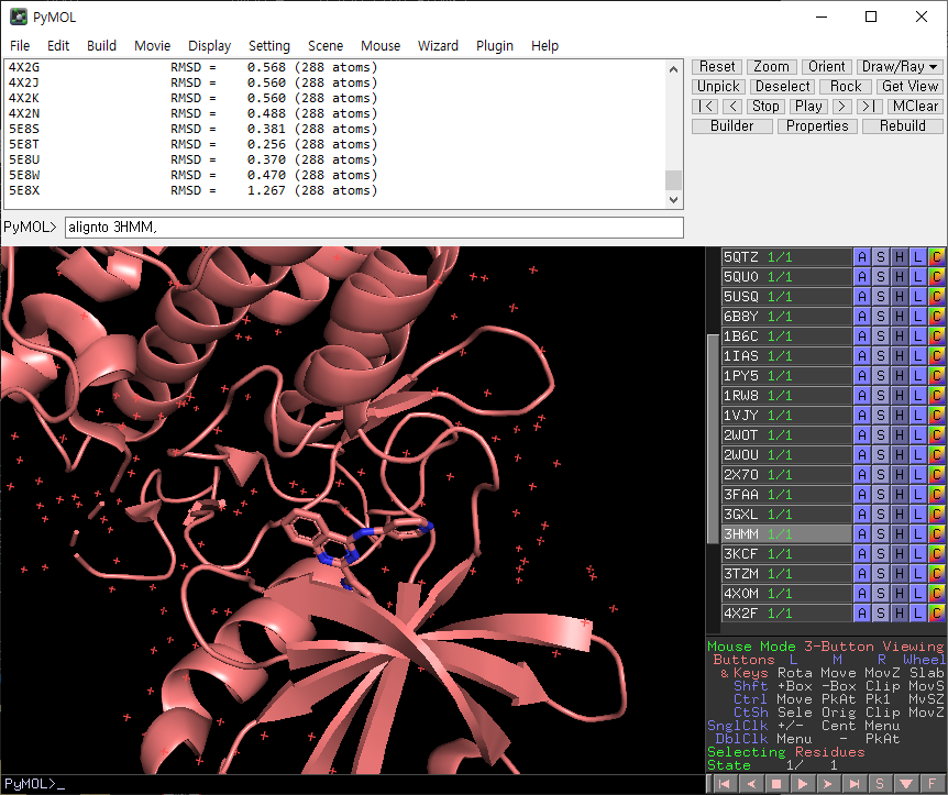 pymol 창에서 alignto 3HMM을 입력하면 구조 정렬이 진행됩니다.