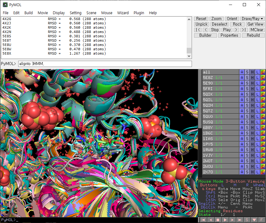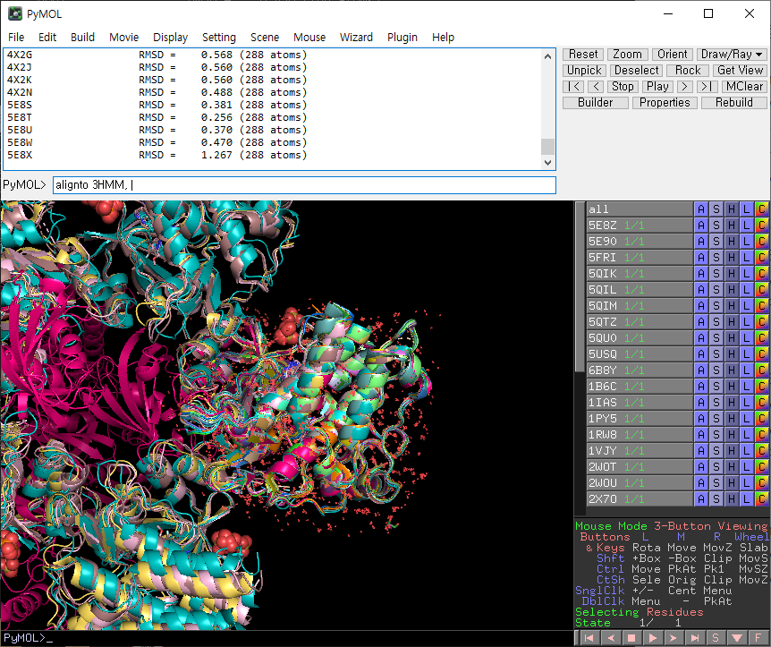 pymol 창에서 alignto 3HMM을 입력하면 구조 정렬이 진행됩니다.