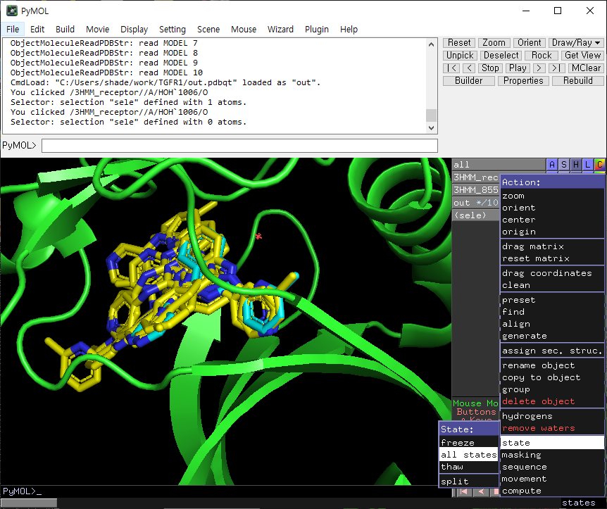 cyan이 crystal 구조, 노란색이 도킹된 구조입니다. 좌측은 model1만, 우측은 model 1부터 10 전체를 출력했습니다.