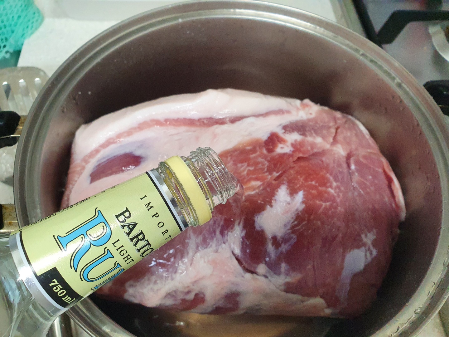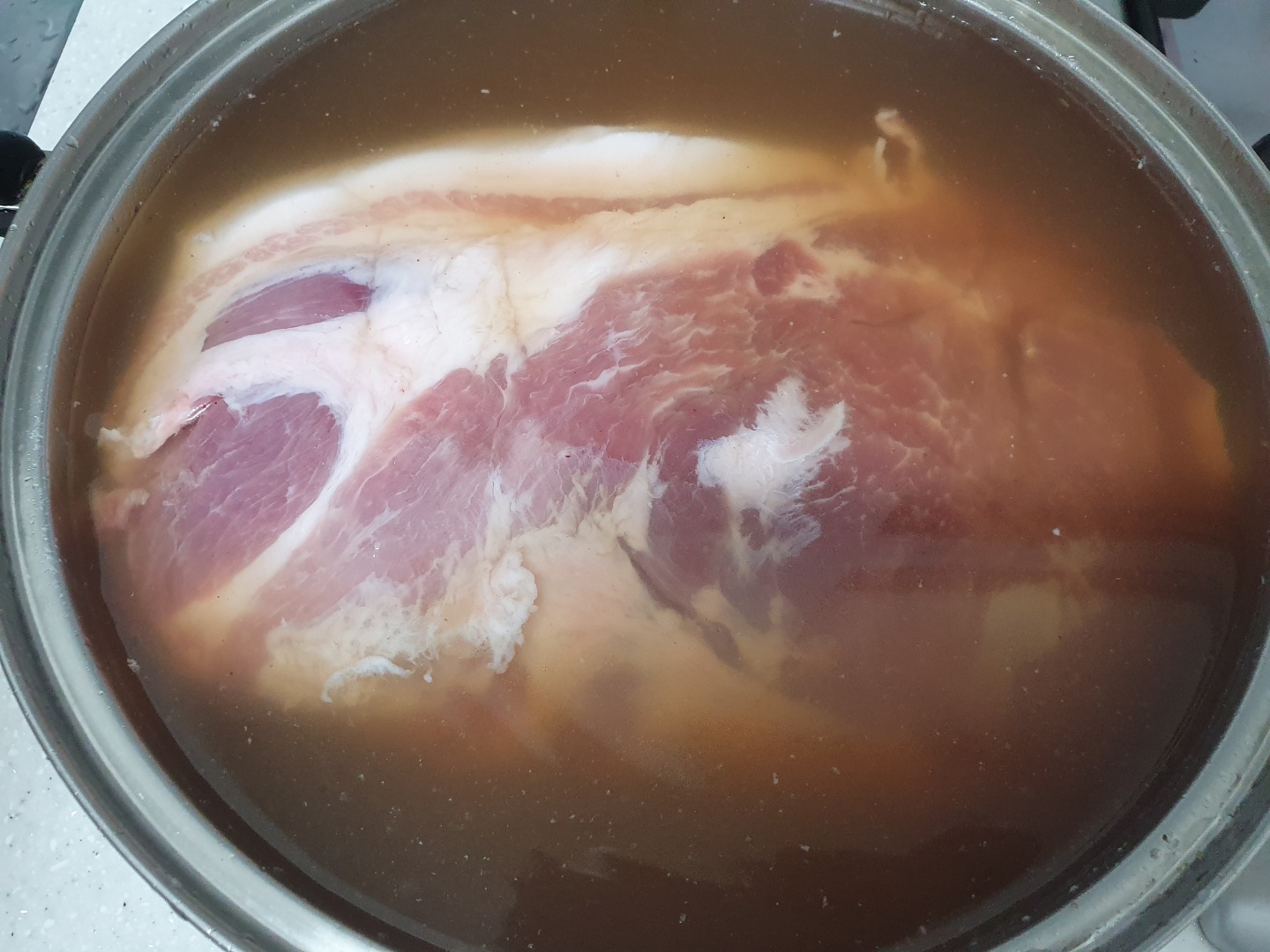 적당히 식으면 고기에 부어줍니다. 술도 적당히 넣어줍니다. 물 양은 고기가 완전히 잠길 정도입니다.