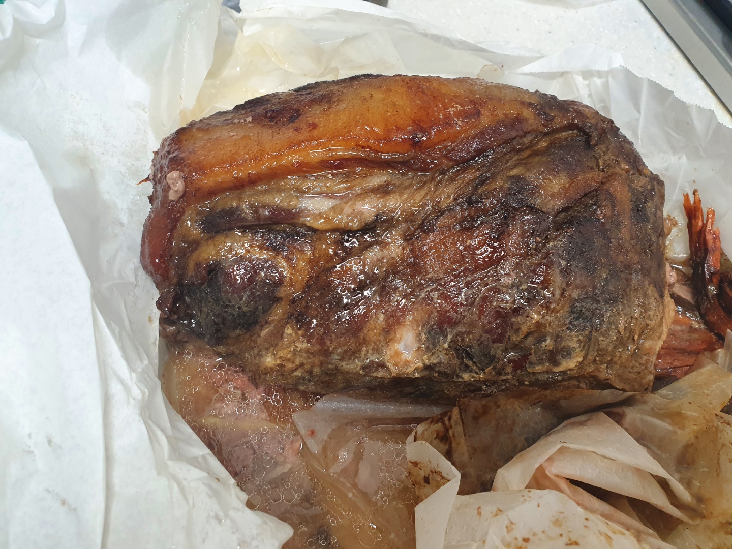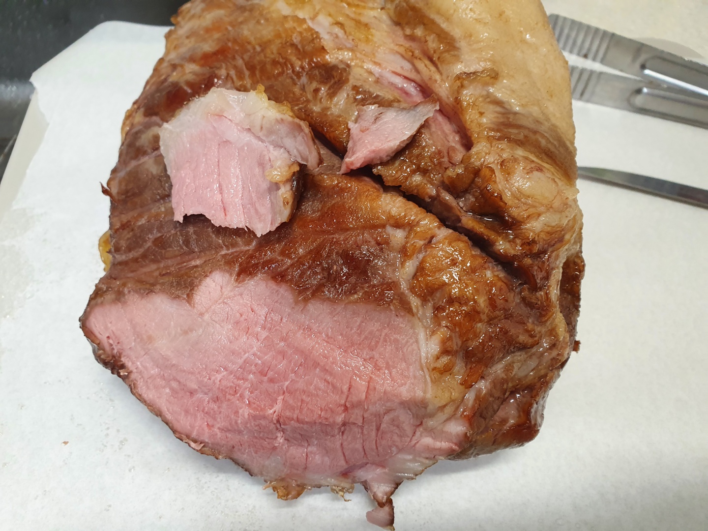 썰어보니 조금 핏기가 있긴 하지만, 햄 맛이었습니다. 이대로도 맛있었고... 이 세팅으로 몇 시간 더 익히면 햄이 되었겠지만... 원래 만들려는 것이 풀드포크였어서 포일로 싸서 온도를 올렸습니다.