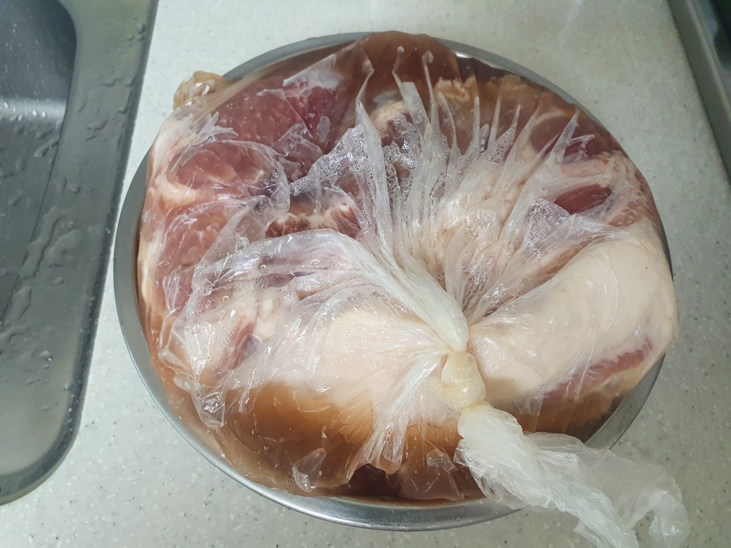 해동이 끝나면 소금물에 4시간 정도 담가서 핏물을 제거합니다.