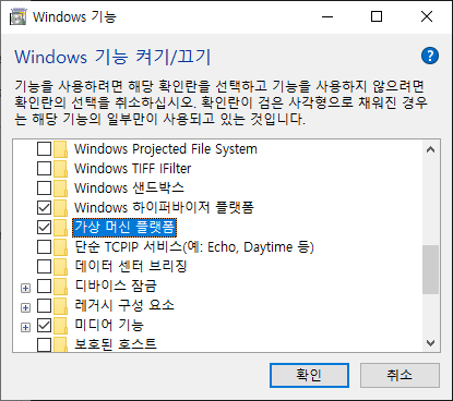 실패했다면, windows 기능 켜기/끄기 에서 Hyper-V , 하이퍼바이저 플랫폼, 가상머신 플랫폼을 선택해서 설치해줍니다.
