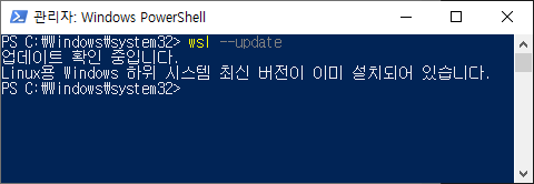 만약 안된다면, powershell에서 wsl --update 를 입력하여 업데이트를 한 후 wsl을 다시 시작합니다.