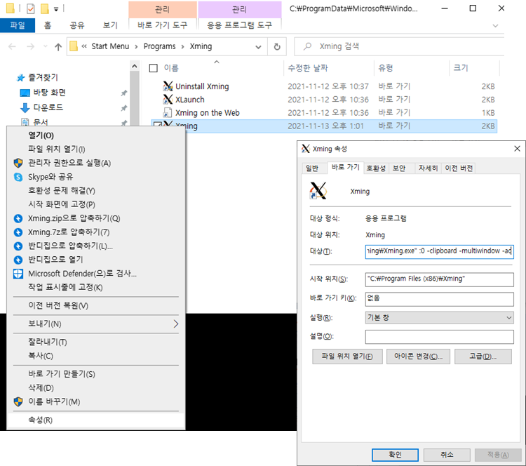 xming 우클릭 ->속성 클릭 -> 대상에 다음 항목 입력