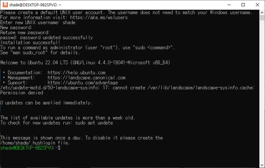 만약 안된다면, powershell에서 wsl --update 를 입력하여 업데이트를 한 후 wsl을 다시 시작합니다.