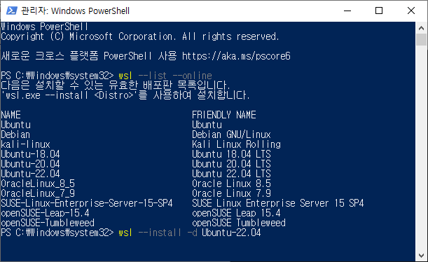 wsl --list --online 을 입력하면 설치할 수 있는 배포판 목록이 나옵니다.