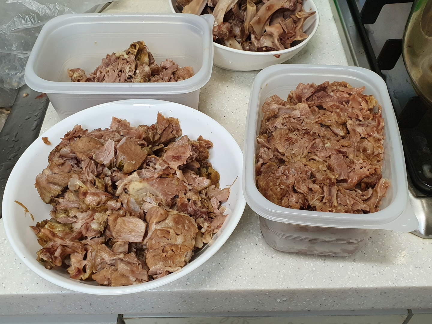 뼈에서 고기를 분리해서 따로 담아줍니다. (감자탕에 뼈 발라서 순살 감자탕 만드는 사람은 별로 없겠지만... 직장 가져가려고 살 발랐습니다.) 국물은 체에 걸러서 뼛조각과 향신료를 제거합니다.