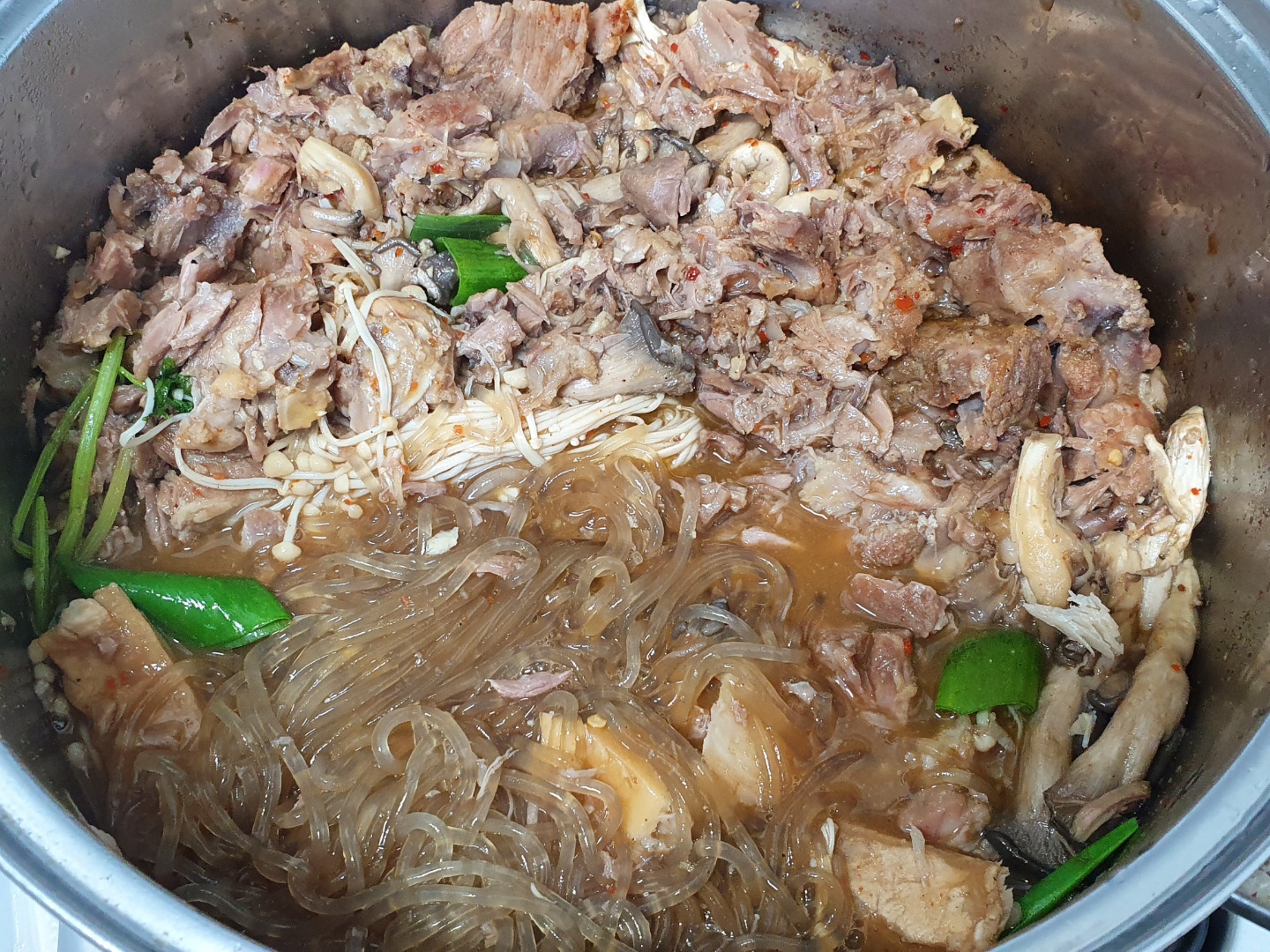 그리고 건더기를 건져버리고 버섯, 파, 고수, 고기, 불린 당면을 넣고 끓입니다. 뭐.. 색은 진하게 나오지 않아서 아쉽지만... 맛은 좋았습니다.