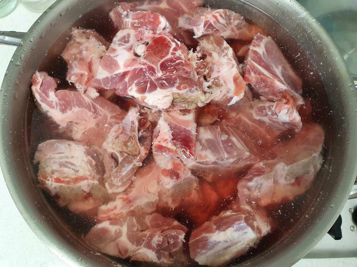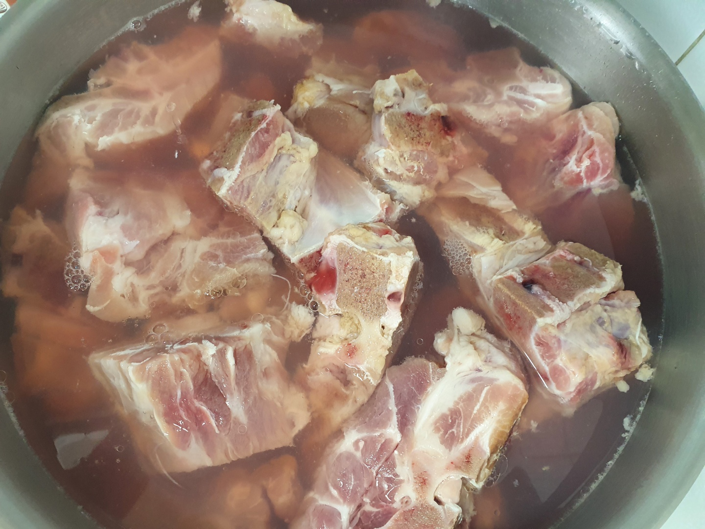 다음날 아침... 고기에서 붉은색이 많이 사라졌습니다. 그리고 초벌로 삶습니다.