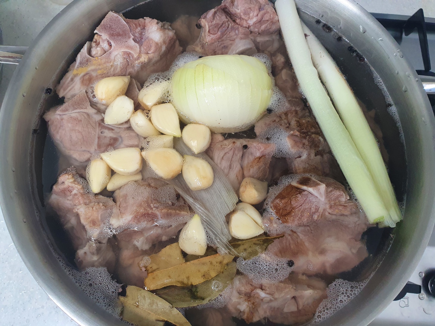 초벌로 삶은 고기에 찬물을 넣고 채소, 향신료를 넣고 삶아줍니다.