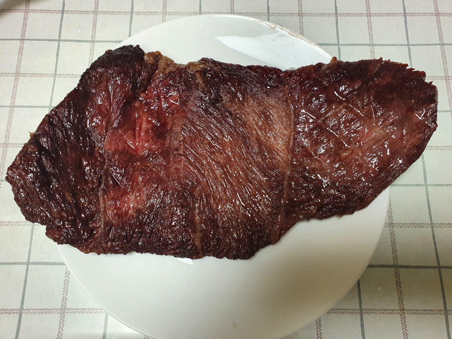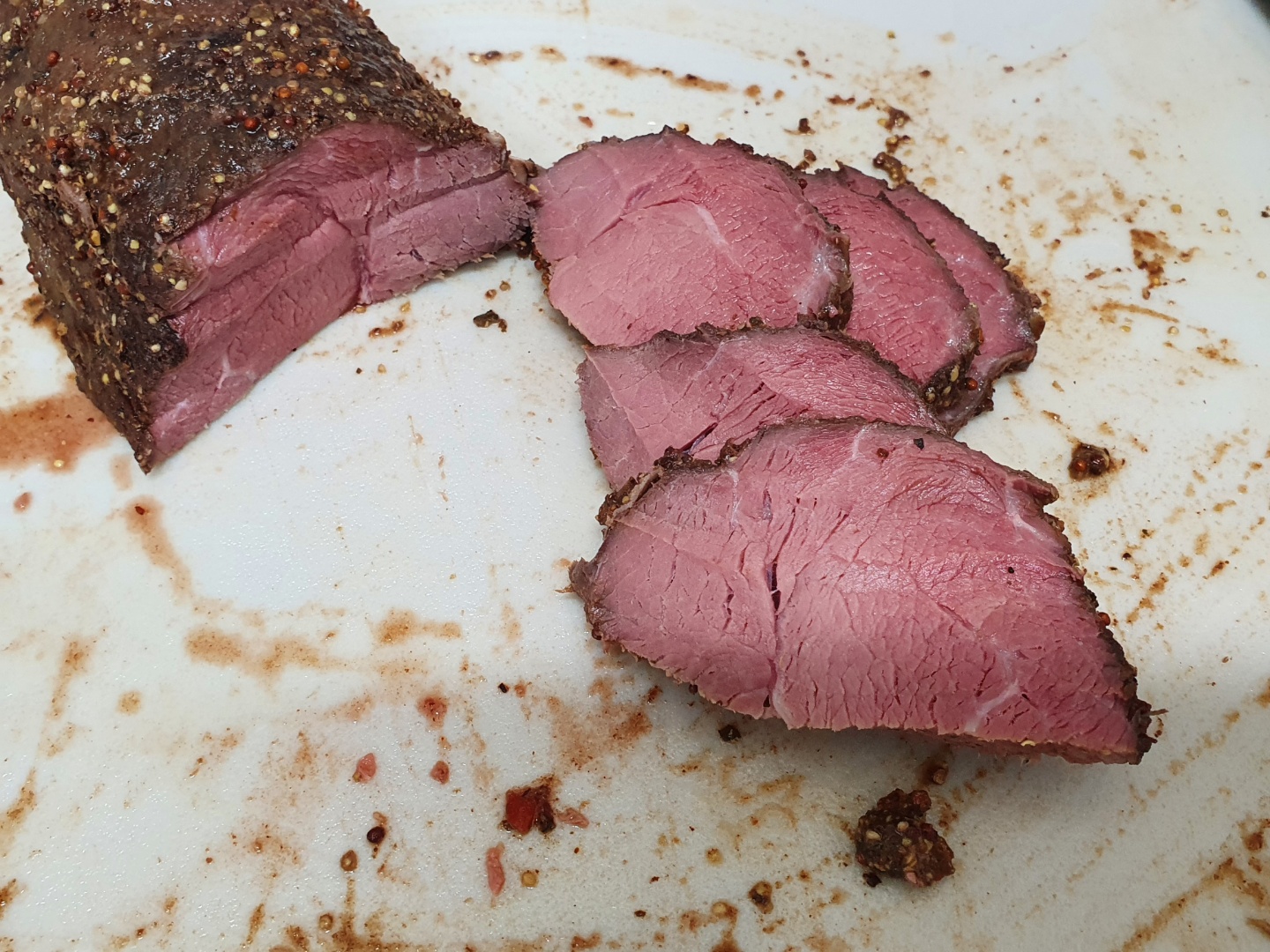 원래는 이후에 추가로 브리스킷처럼 심부온도를 90도 이상으로 올리면서 오래 구울까 했는데, 이상태로도 부드러워서 굳이 안 해도 되겠다 생각해서 이대로 끝냈습니다. 적당히 부드럽고 맛있었습니다. 로스트비프 같은 질감입니다.