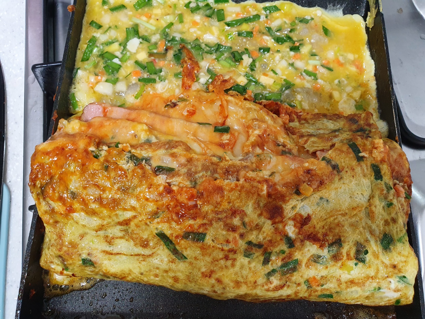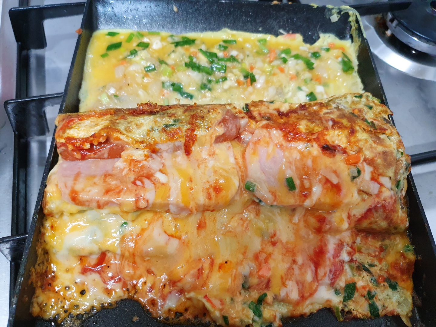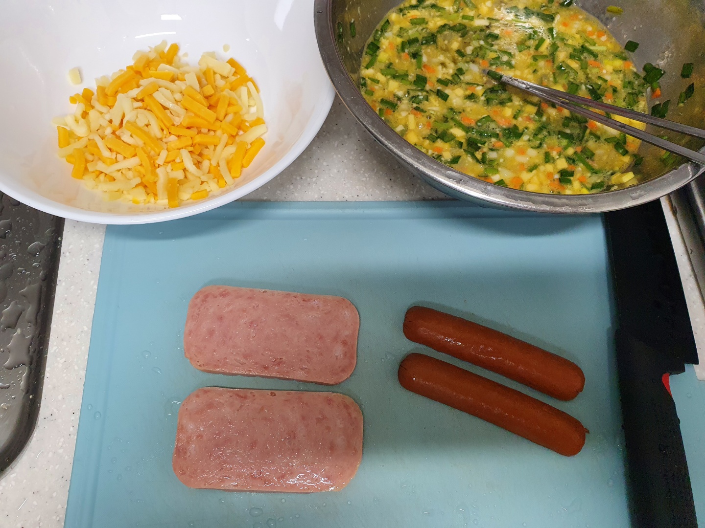 재료는 계란 5개, 게살, 새우살, 부추, 마늘, 양파, 파, 당근, 애호박, 목우촌 주부9단 소세지, 목우촌 뚝심(딱히 상표명은 별로 중요하지 않아서 스팸이라 하려 했는데, 스팸이 아닌 것을 스팸이라고 하면 혼난다고 합니다.), 슈레드 치즈(모차렐라+ 체다), 케첩, 마요네즈, 다시마 물 약간, 소금, 후추입니다.