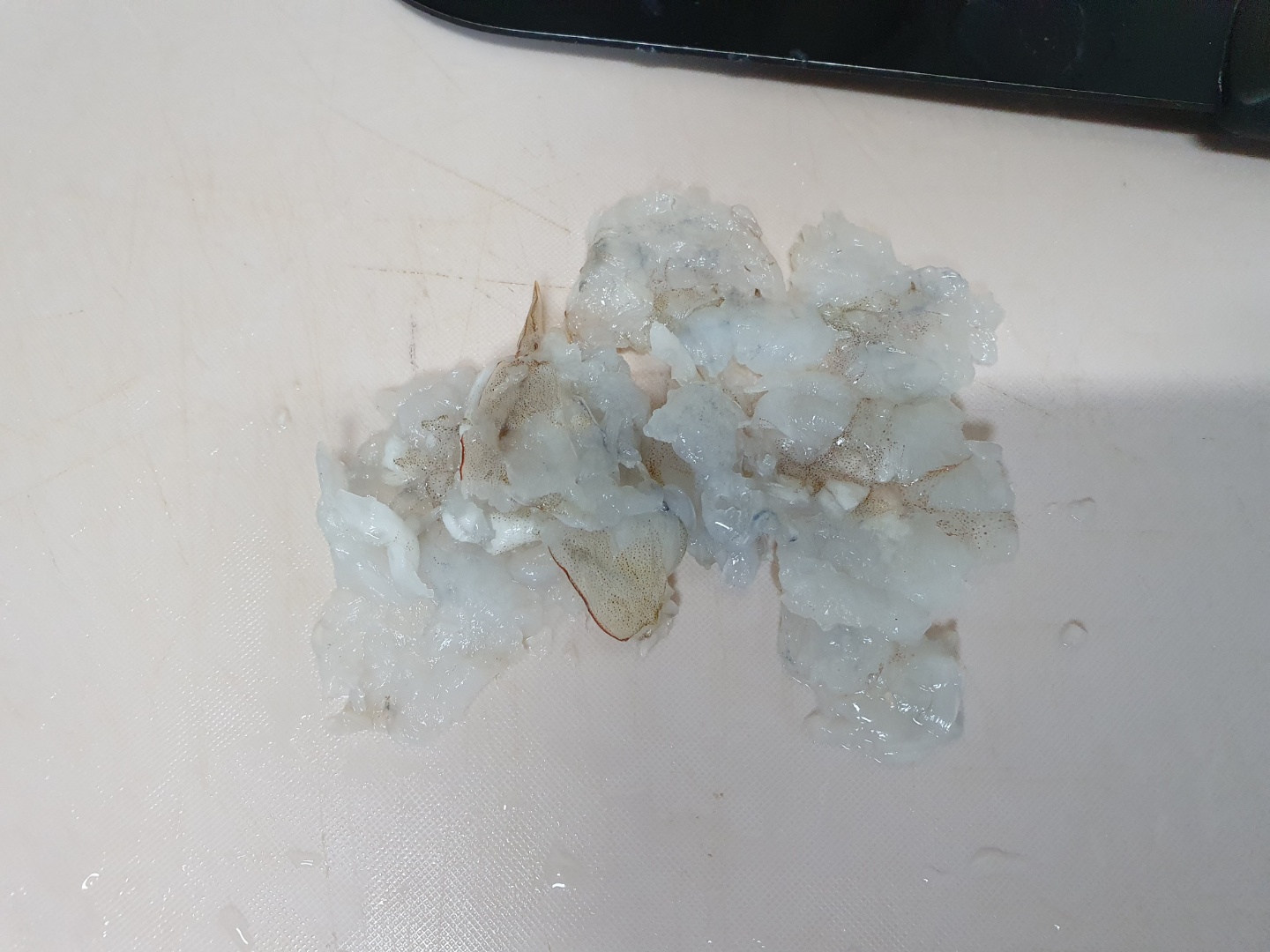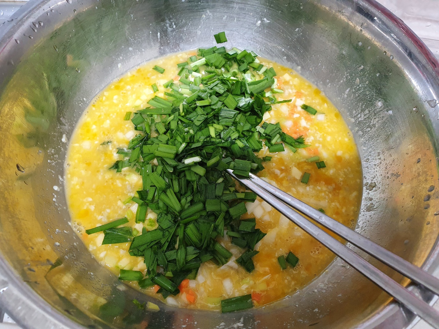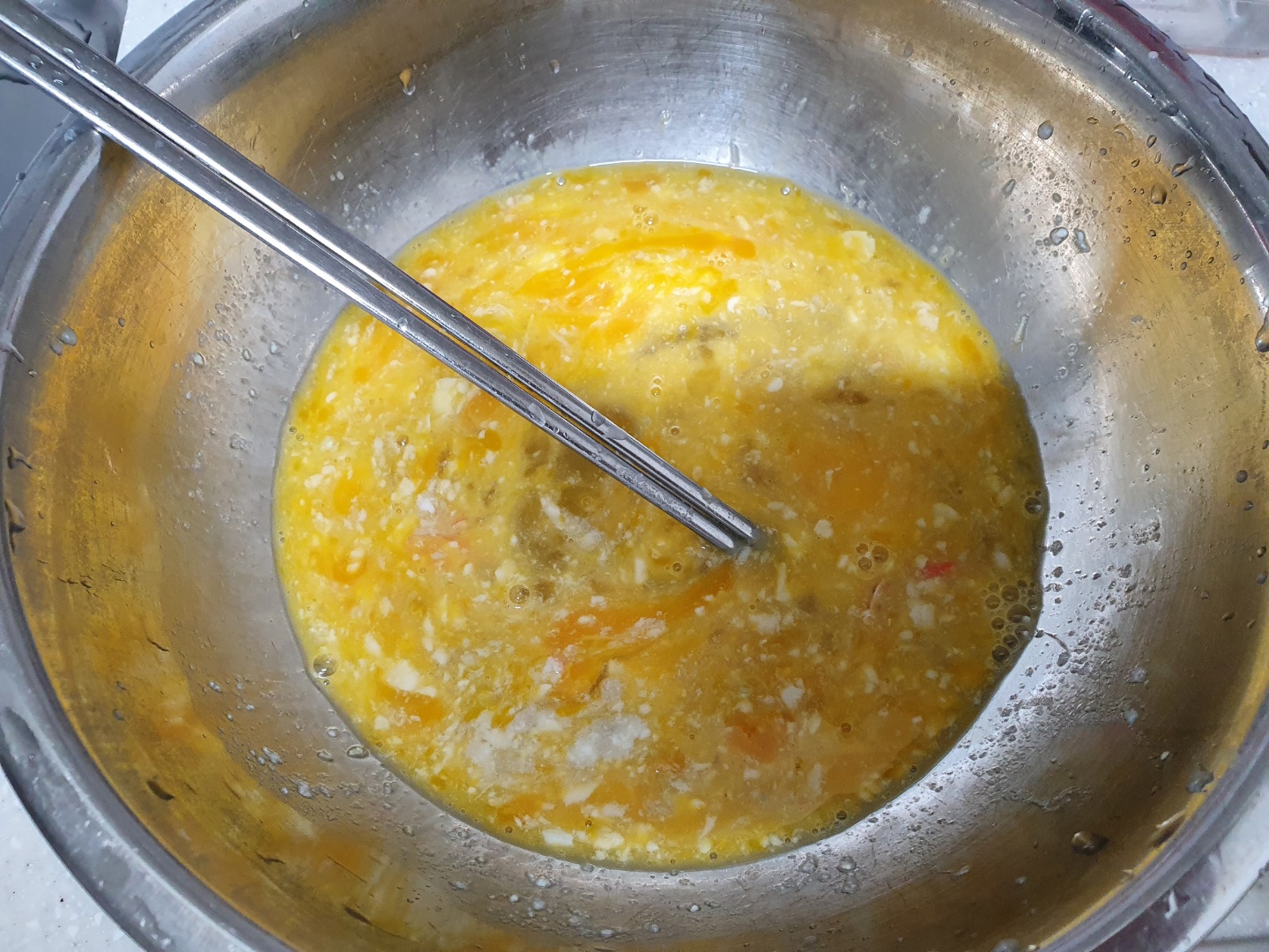 계란에 채소를 투입합니다. 새우는 칼 옆면으로 누른 후 썰어서 투입합니다.