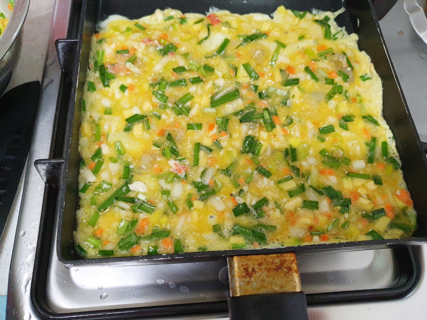 재료는 계란 5개, 게살, 새우살, 부추, 마늘, 양파, 파, 당근, 애호박, 목우촌 주부9단 소세지, 목우촌 뚝심(딱히 상표명은 별로 중요하지 않아서 스팸이라 하려 했는데, 스팸이 아닌 것을 스팸이라고 하면 혼난다고 합니다.), 슈레드 치즈(모차렐라+ 체다), 케첩, 마요네즈, 다시마 물 약간, 소금, 후추입니다.