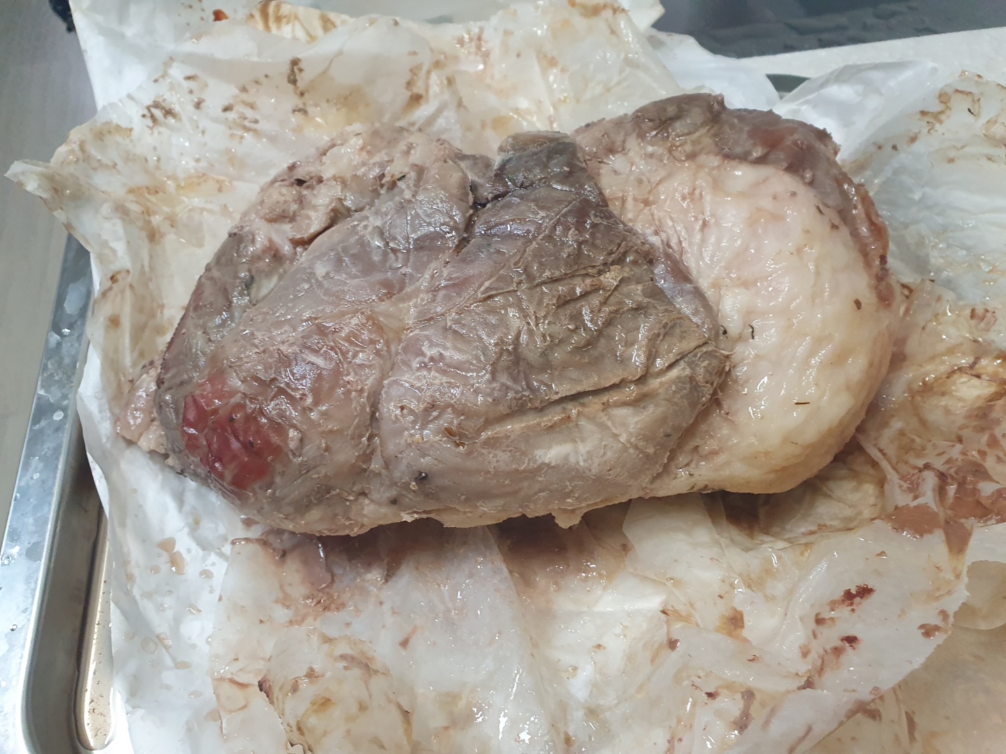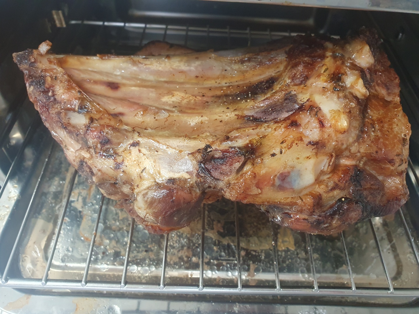 고기가 부드러워지긴 했는데 뼈에 붙은 살이 떨어질 정도는 아니라서 호일을 제거하고 불에 좀 더 가깝게 해서 120 도에서 1시간 더 구웠습니다. 불에서 멀리 120도를 하거나, 불에 가깝게 110까지 하거나, 호일로 감싸서 했어야 하는데... 수분이 많이 날아가버렸습니다. 뭐 그래도 나쁘진 않았습니다.