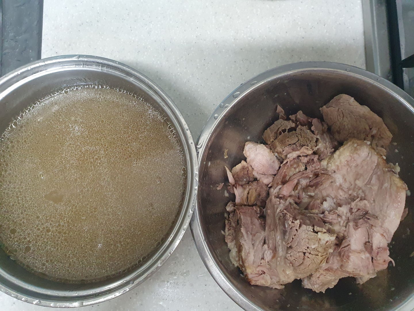 고기를 볶아서 만드는 경우도 있지만, 저는 그냥 푹 끓인 고기로 만듭니다.