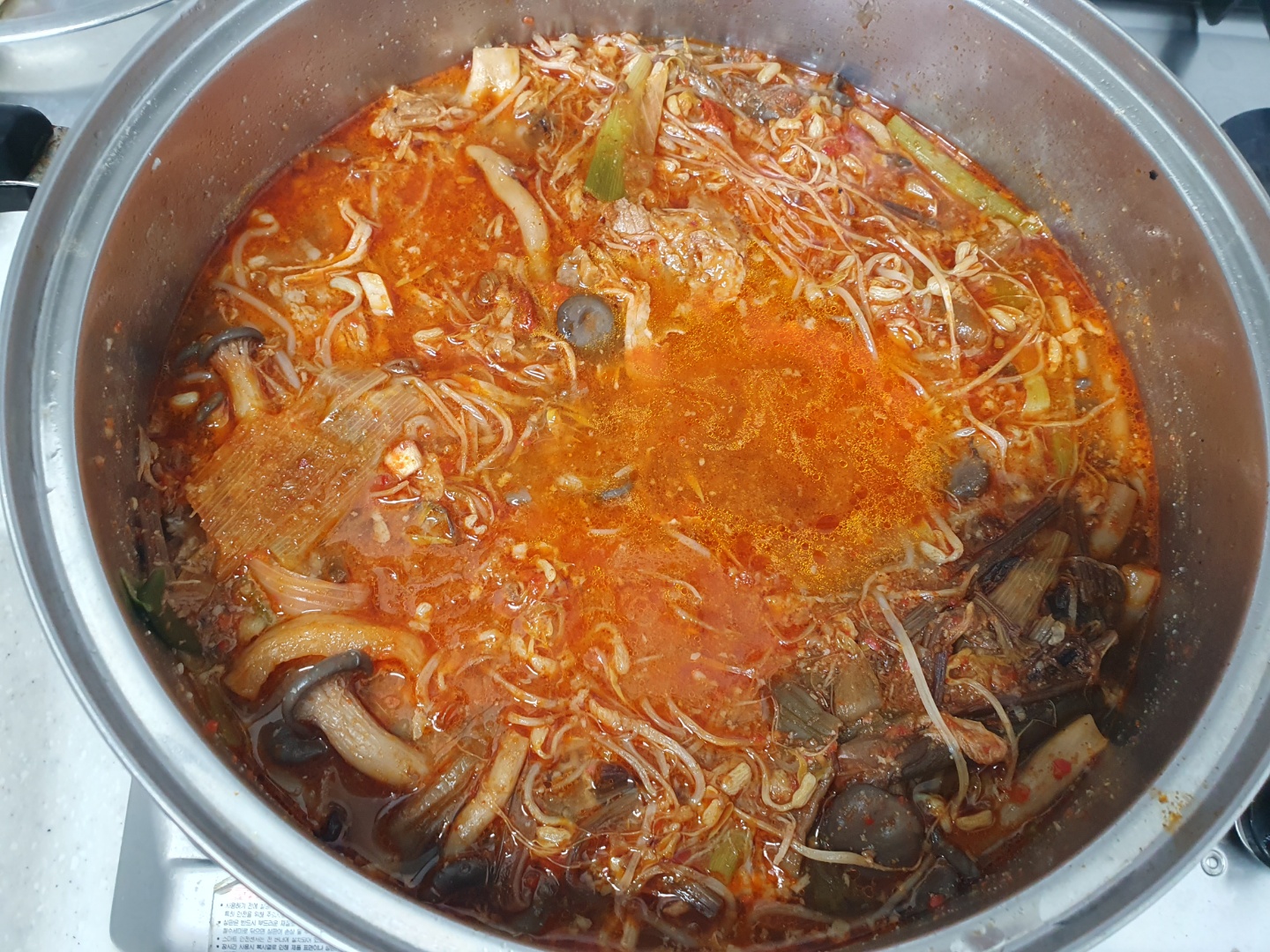 마늘, 무말랭이(...), 후추, 소금, 향신료 조금 넣고 한시간 좀 넘게 삶은 거 같은데, 매우 잘 삶아졌습니다. 고기는 부드럽고 뼈가 쏙 뽑히고 국물도 진합니다.